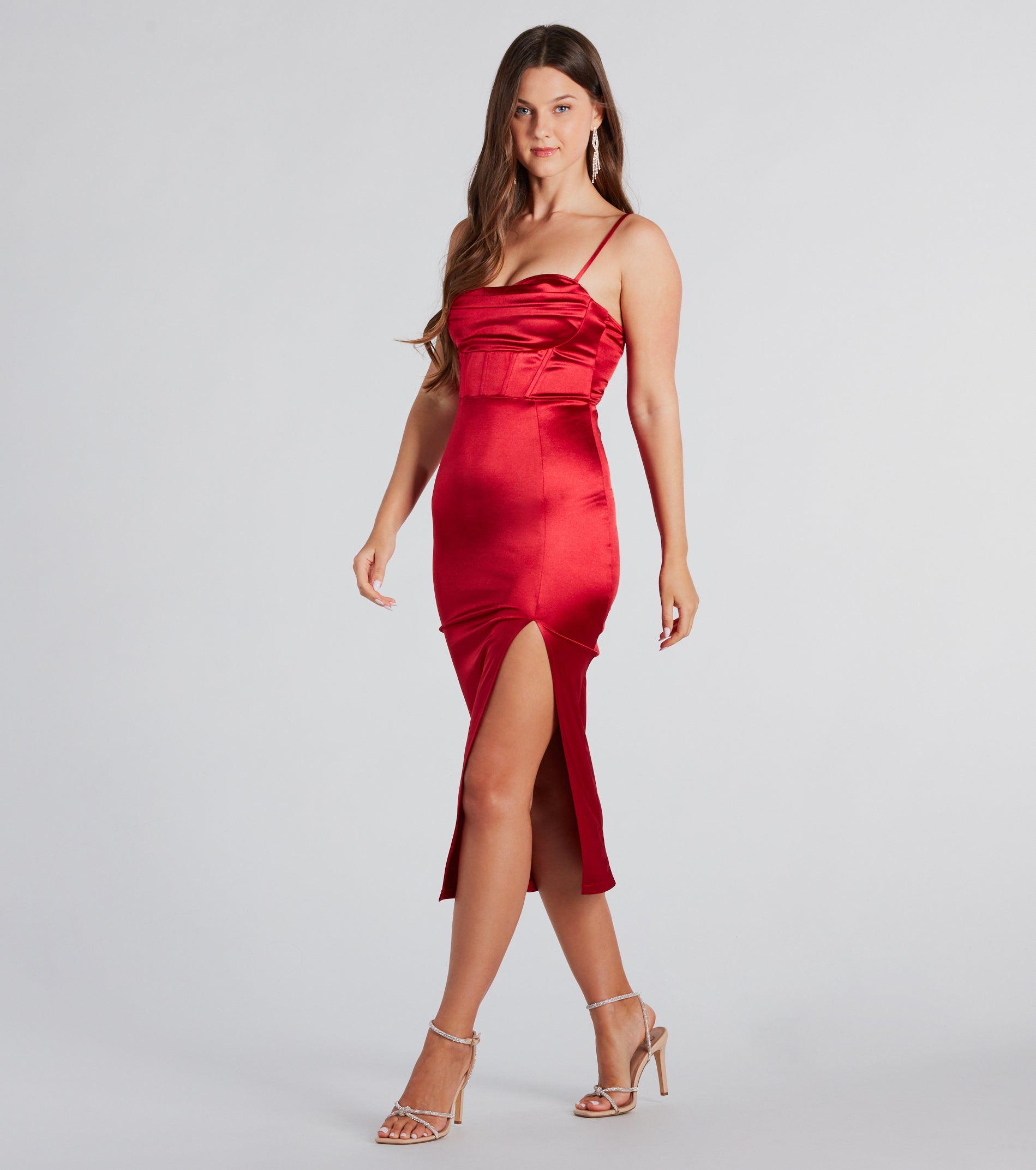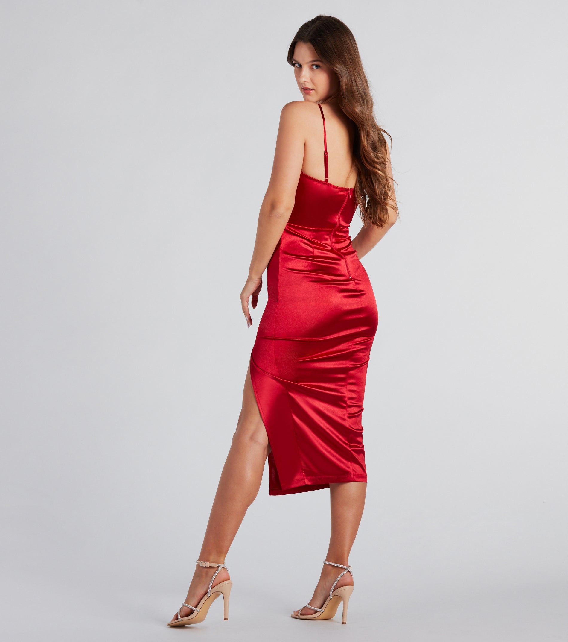 Look and feel effortlessly elegant in the Alena formal satin dress designed to make a statement! Crafted from luxuriously silky satin fabric, this timeless midi-length dress features a sweetheart cowl neckline, adjustable spaghetti straps, a padded bust, flexible boning inserts along the waist, and a bodycon silhouette with a flirty front slit. Complete the look in stiletto heels for a wedding guest or black tie party!