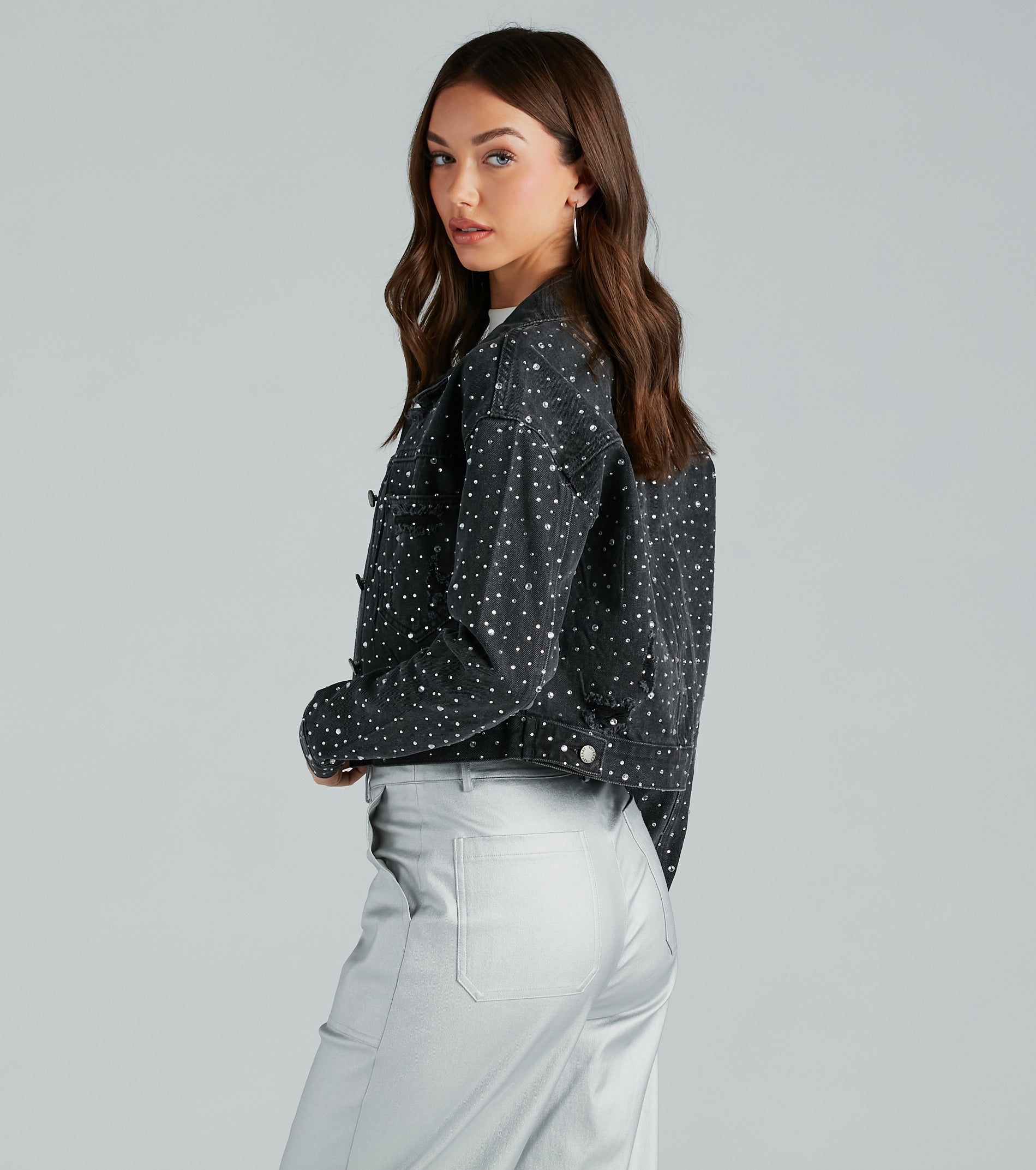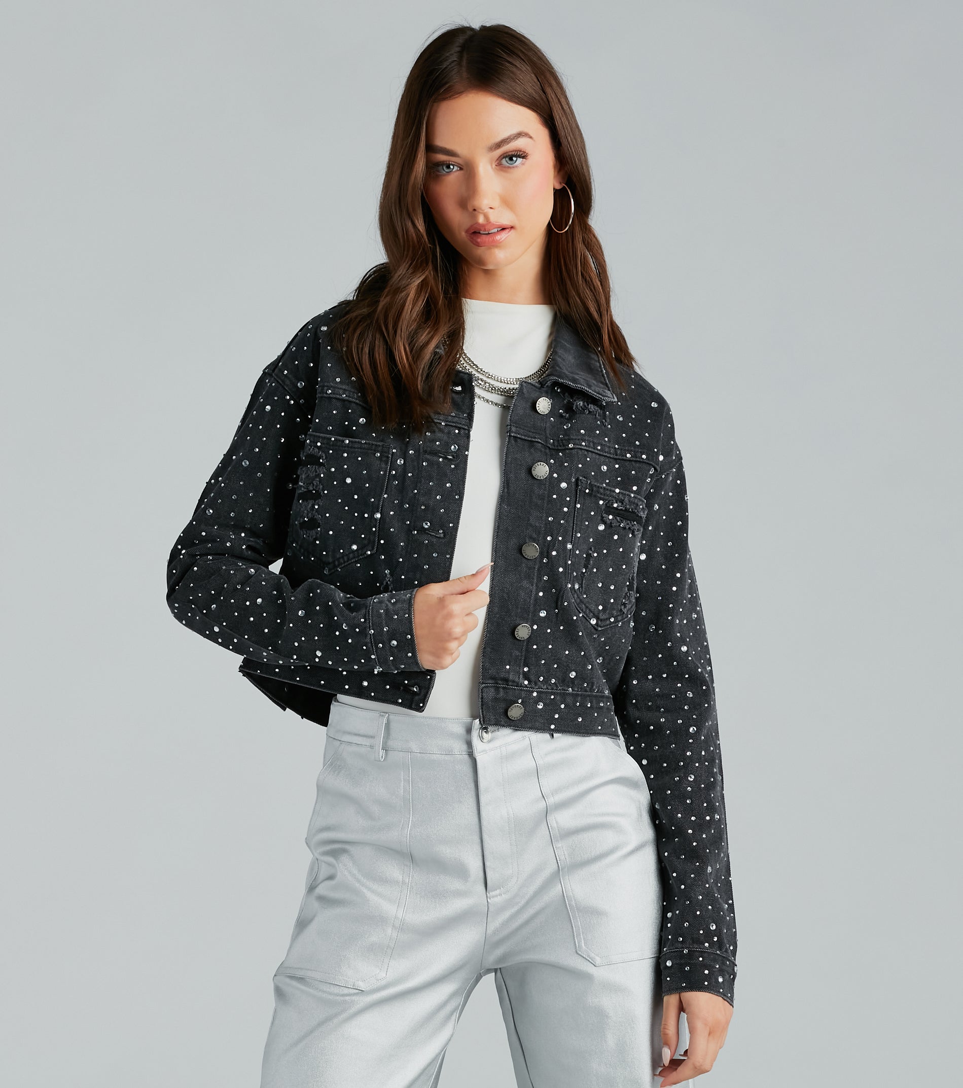 Layer on the casual glamour with this trendy rhinestone cropped denim jacket! It features a collared neckline, long sleeves with buttons to cuff, a complete button-down front, chest pockets, a fitted cropped hem, and all-over sparkling rhinestone embellishments on the subtly distressed denim fabric. Style with hoop earrings and a mini handbag.