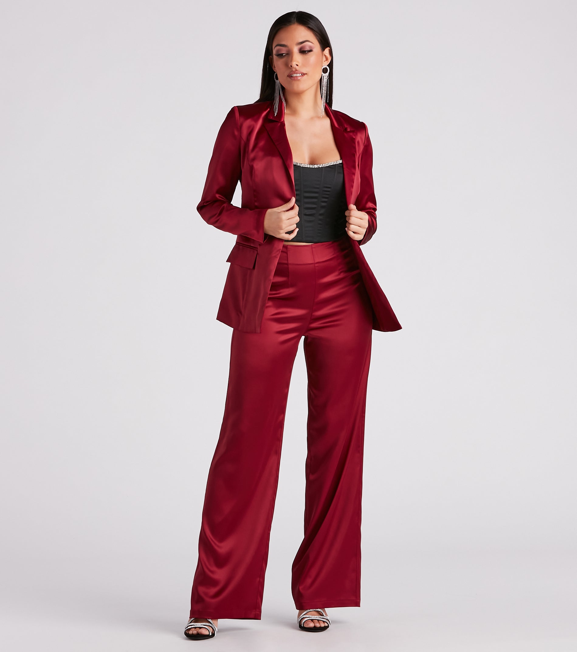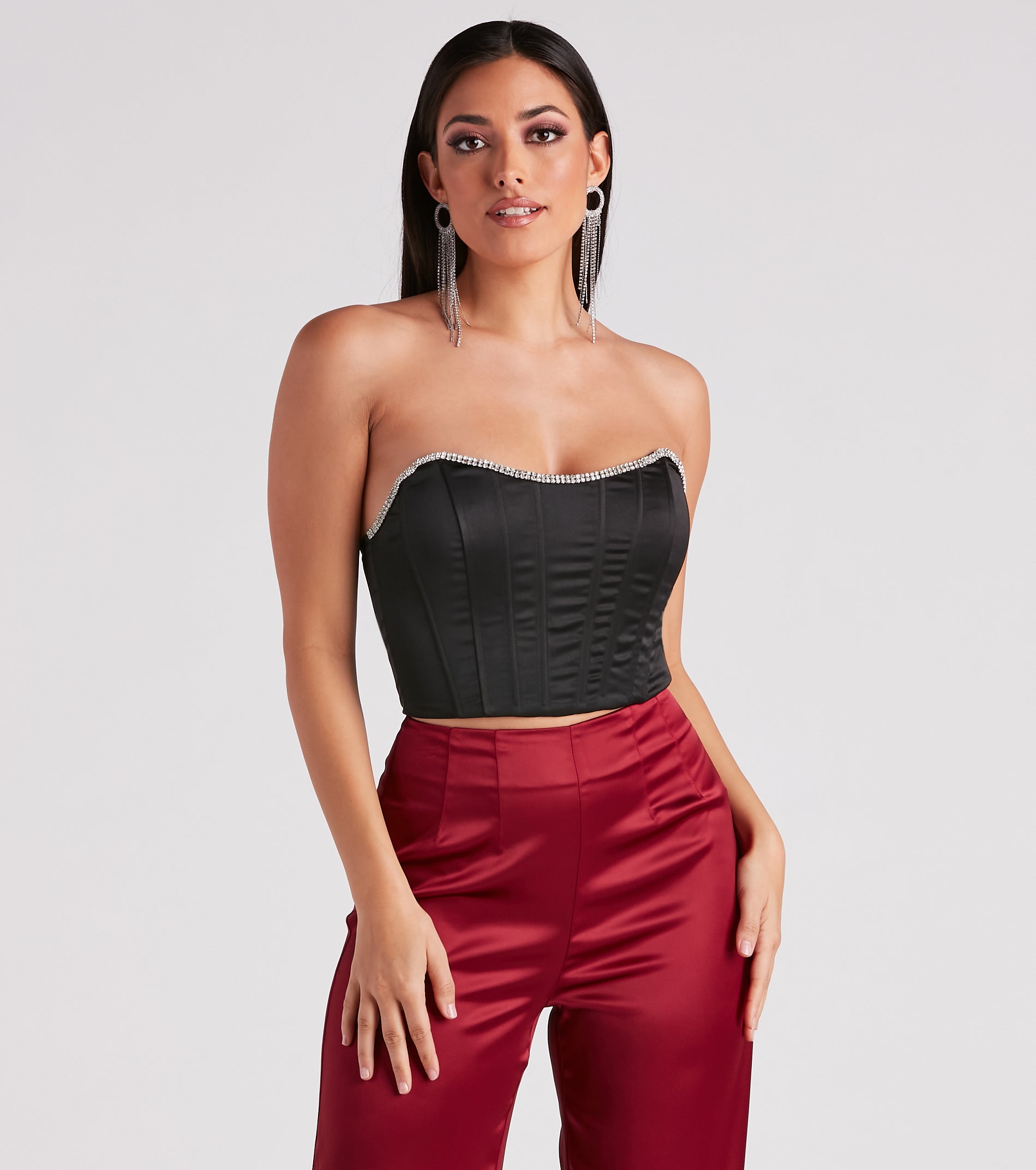A cause for this rhinestone trim bustier is pop-the-bottle worthy! It features a strapless neckline, flexible boning inserts, and back hook-eye closures, composed of satin woven fabric. Complete the look in wide-leg pants for a night out.