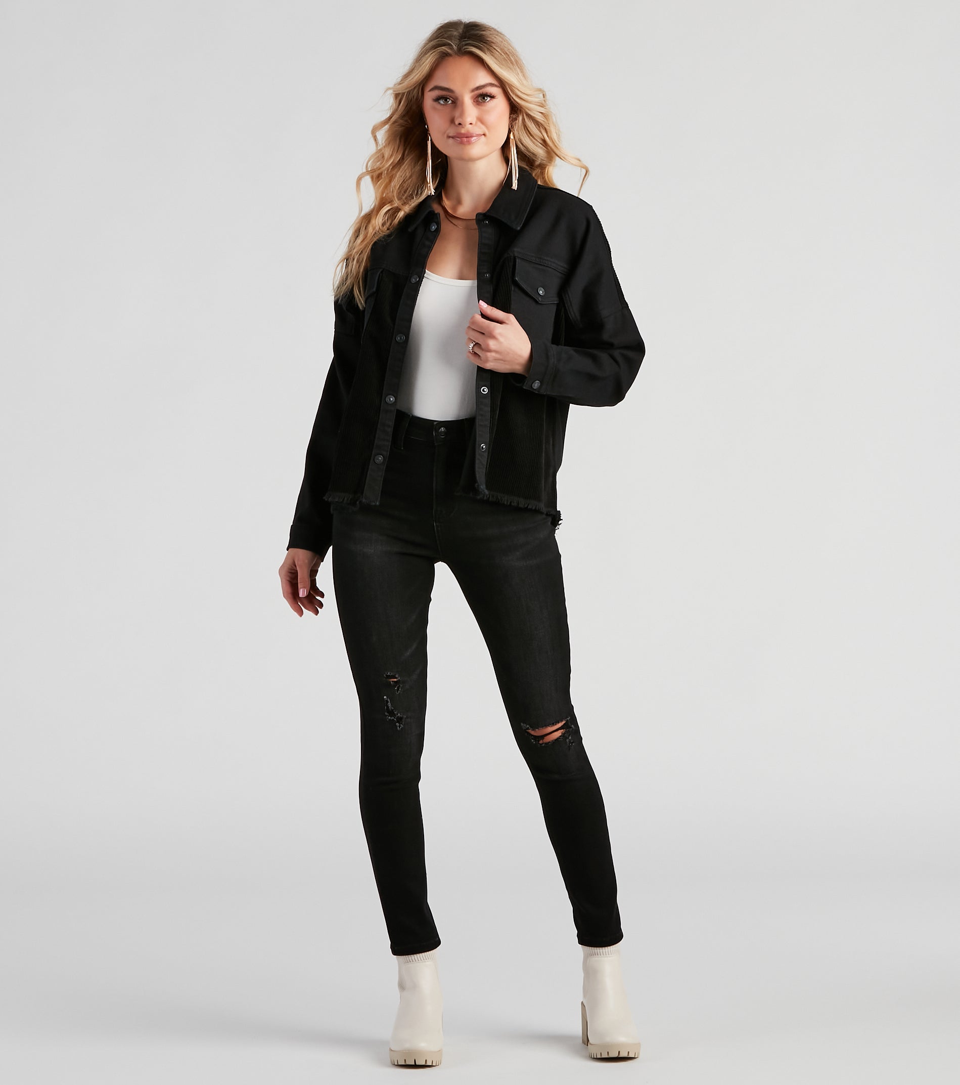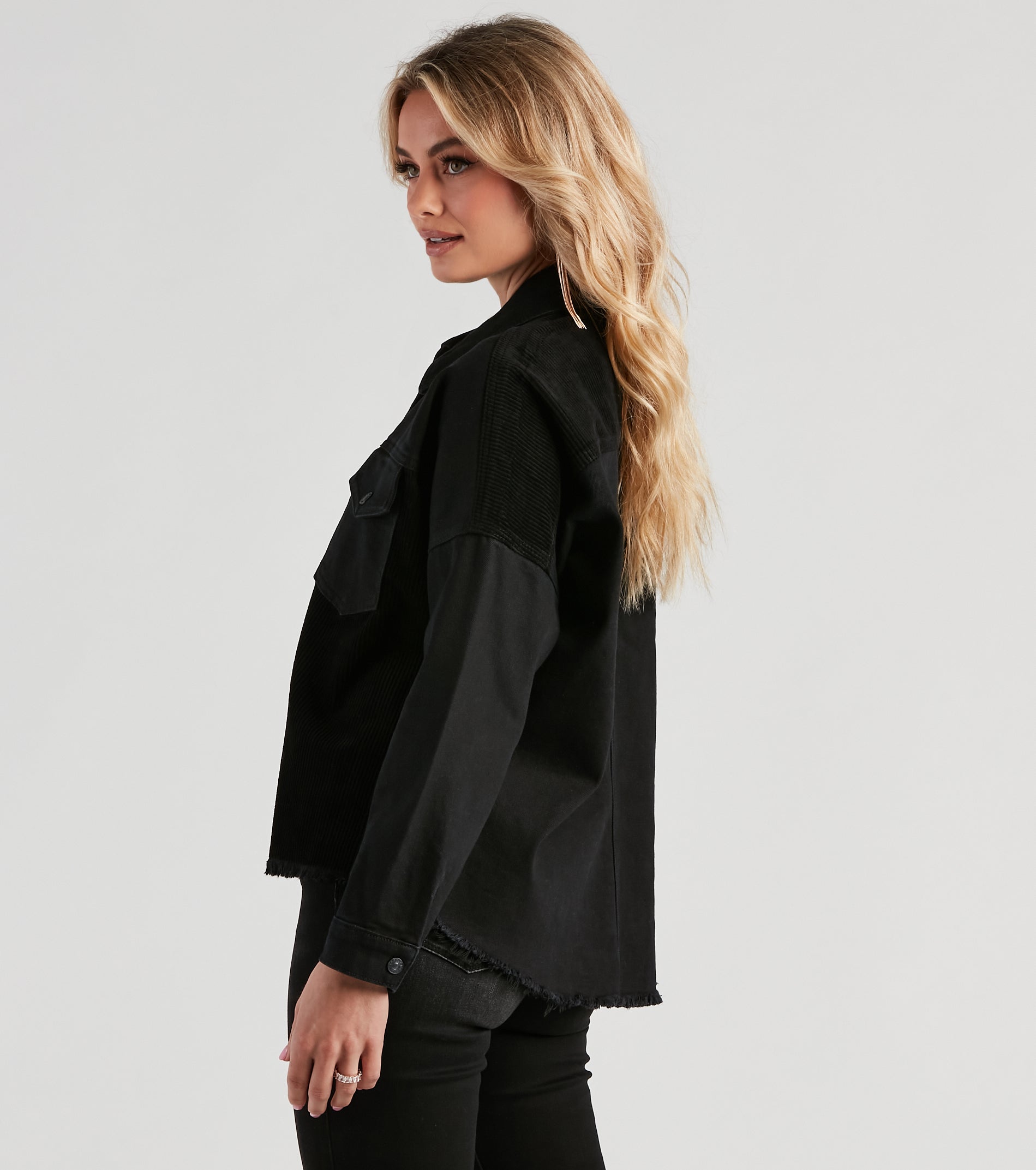 Layer on the chill vibes with this cute and casual jacket! It features a collared neckline, long sleeves, a button-down front, a frayed hem, and a relaxed fit. The jacket is composed of denim and corduroy fabrics for a trendy look. Style it with a basic tee, jeans, and classic sneakers.