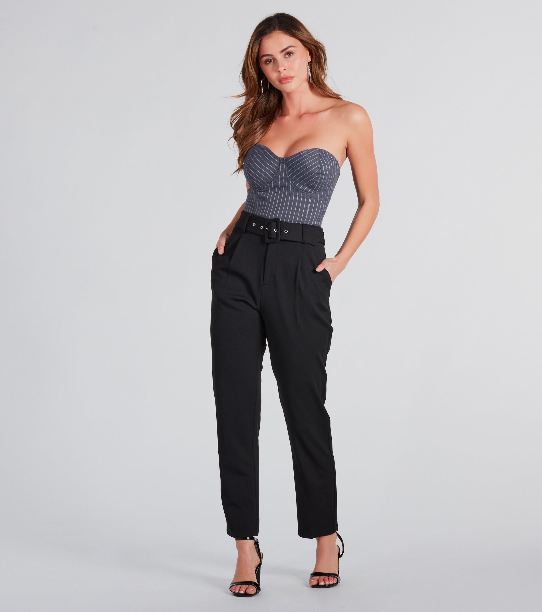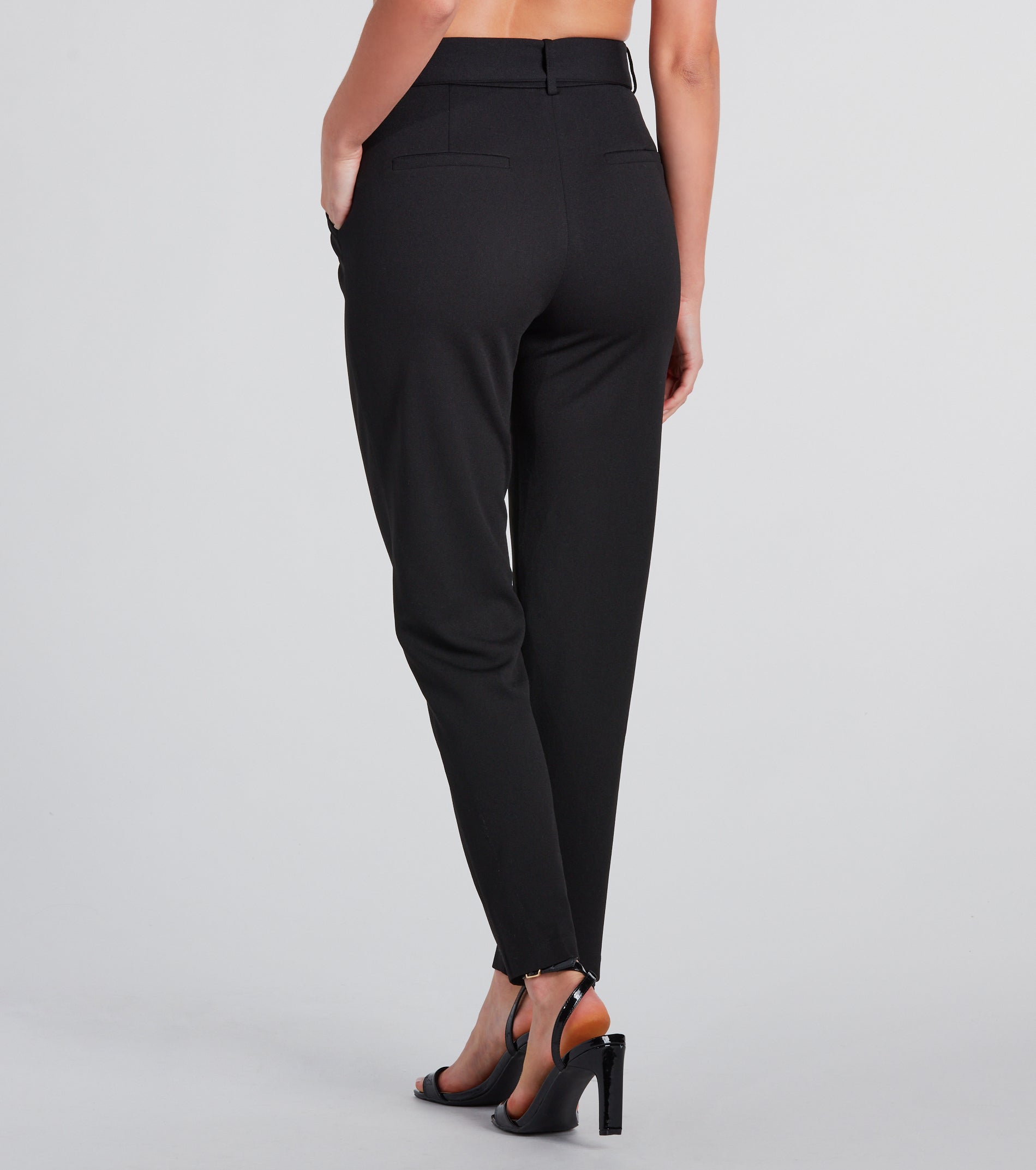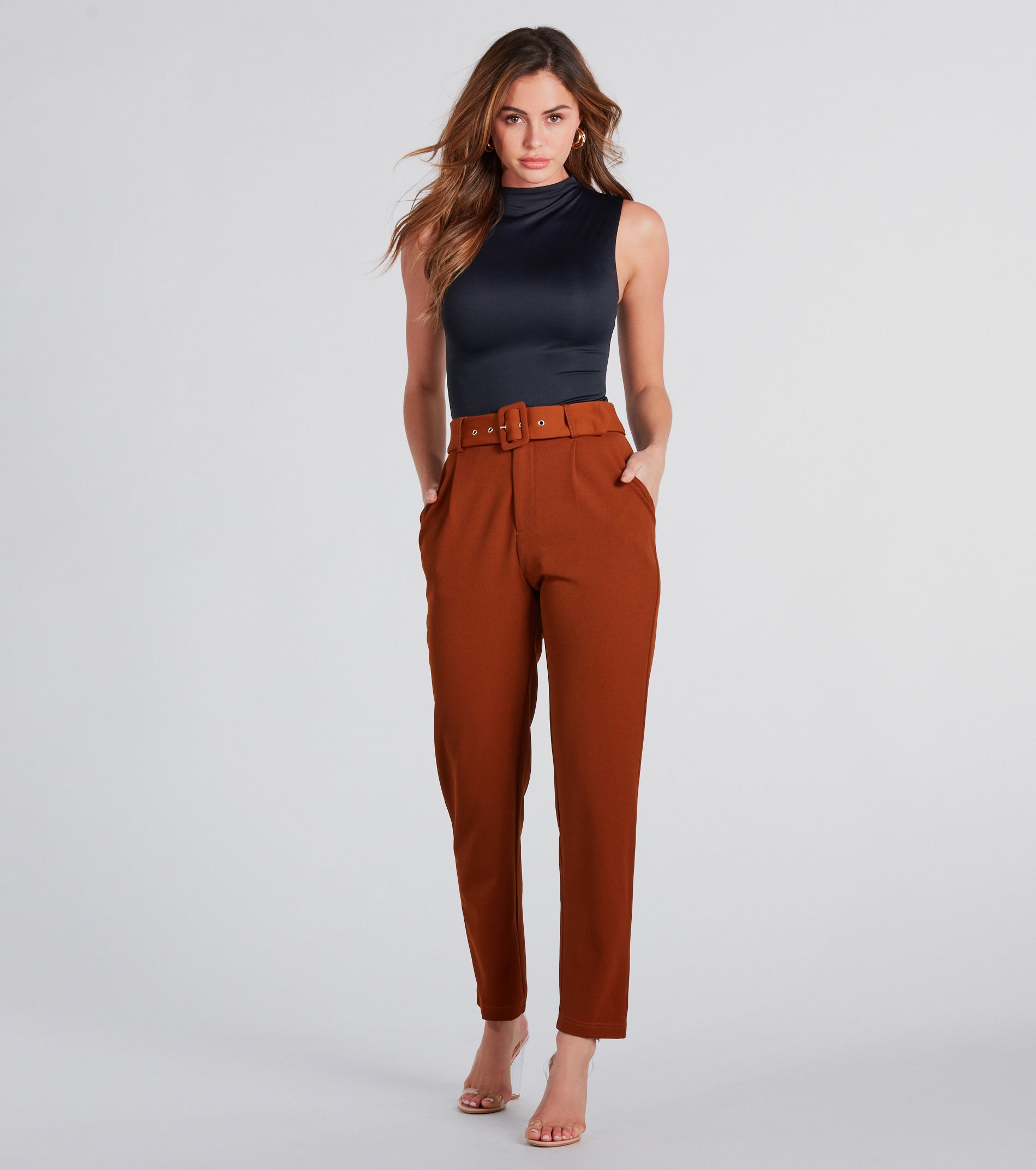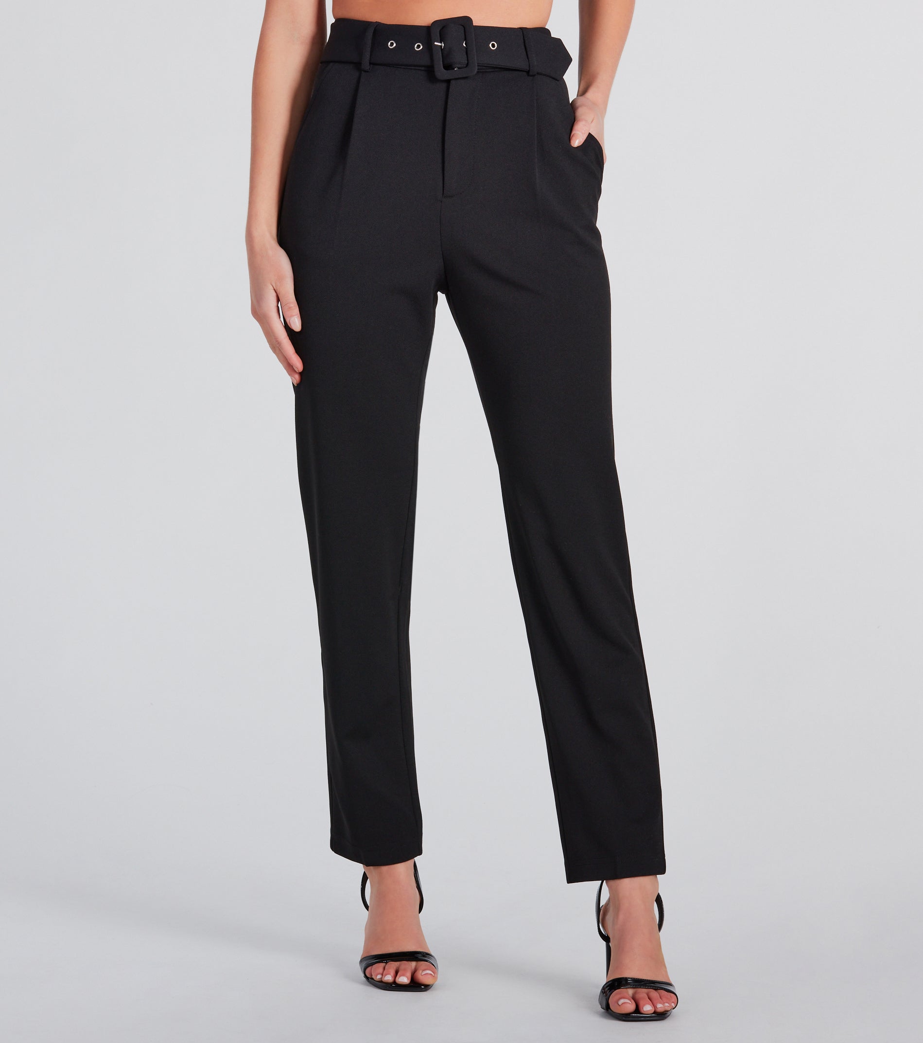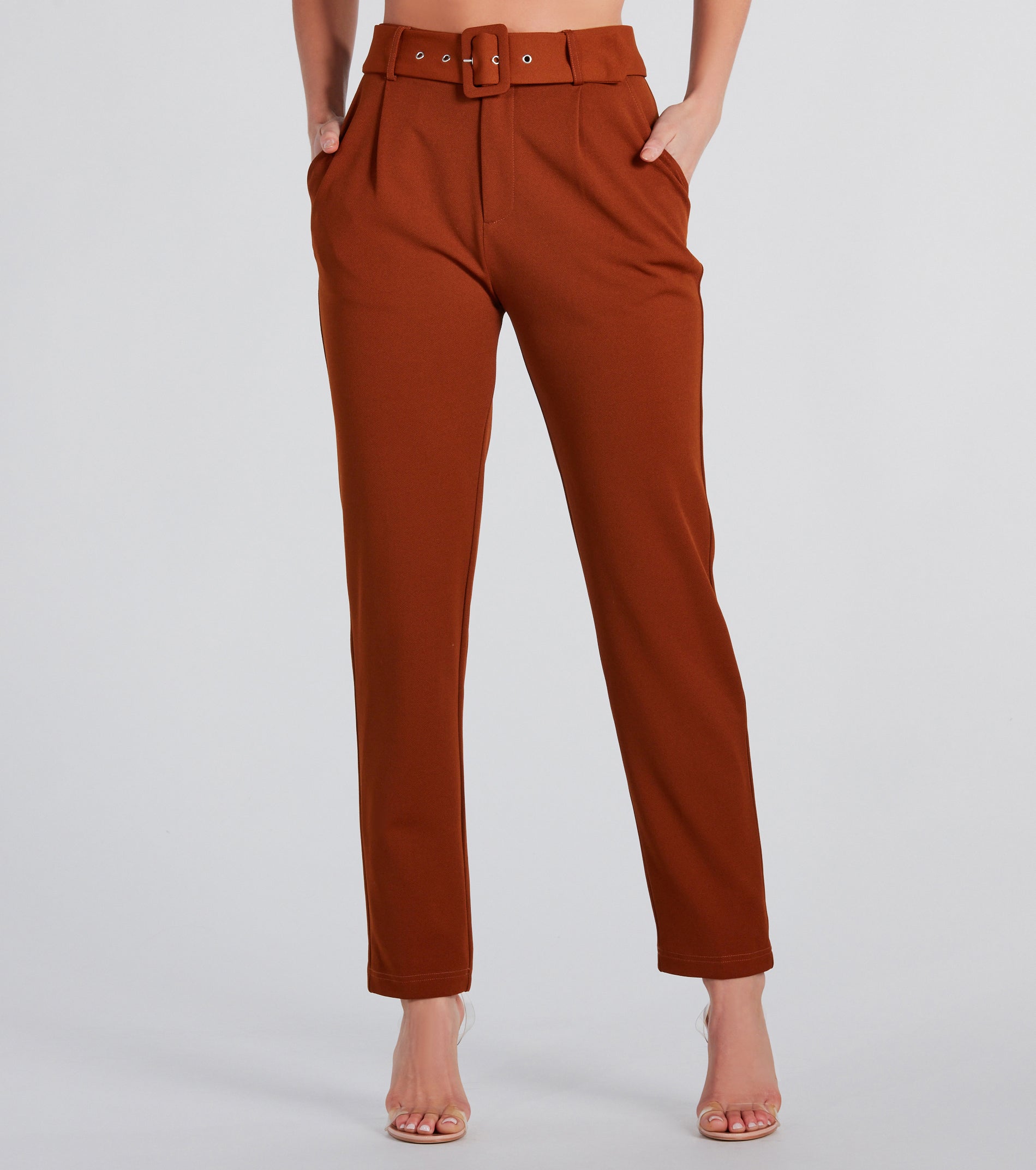 - High-rise belted waist, side pockets
