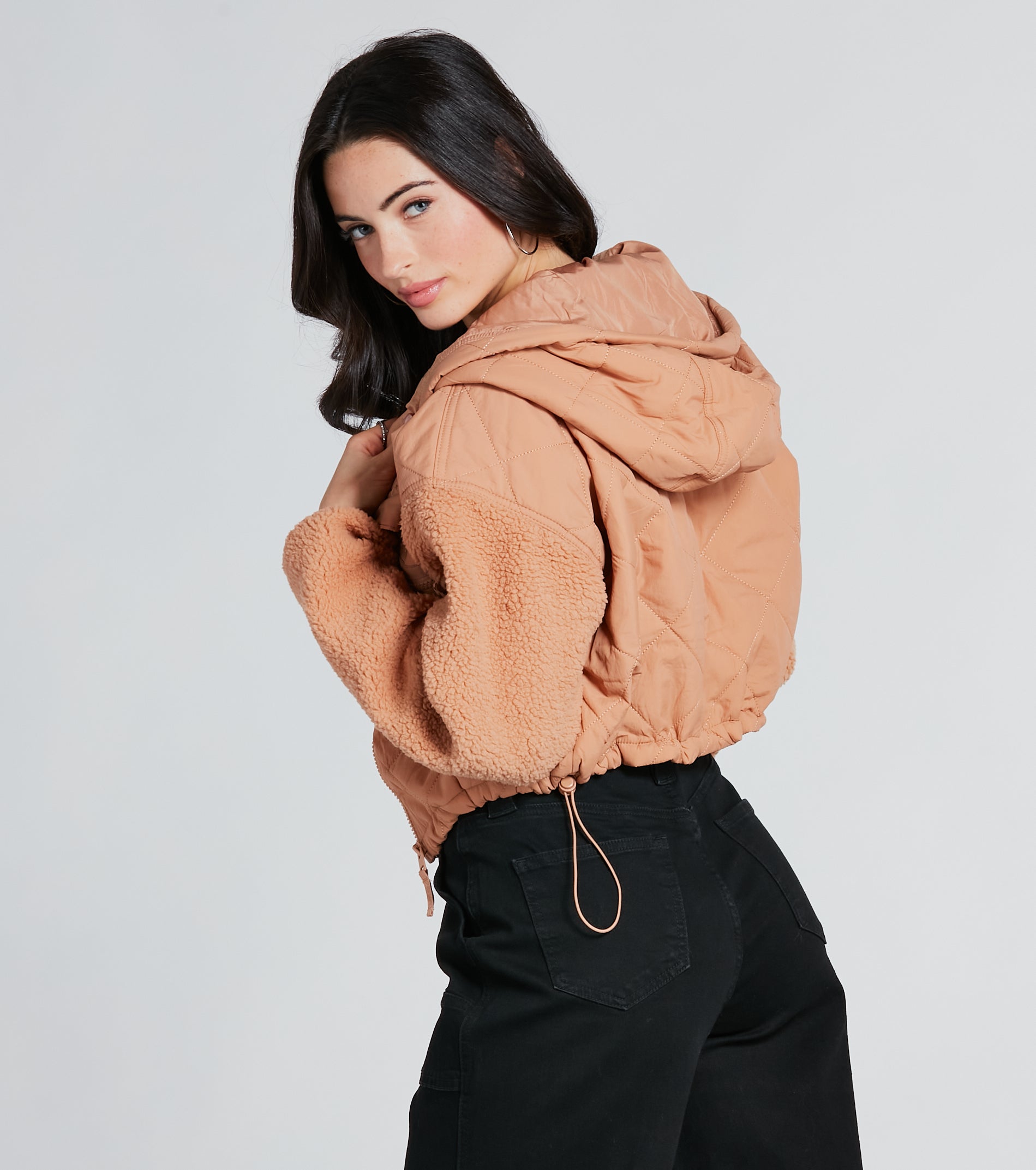 Perfect for staying toasty on cold days, this puffer jacket delivers a cozy style! Designed with warm faux sherpa long sleeves, it features a drawcord hoodie neckline, front zipper closure, and pocket, and a cropped drawcord hem. The jacket is composed of a quilted puffer nylon woven-lined fabric that helps keep you warm and protected from the elements. Style with lug boots for a cute autumn-to-winter outfit!