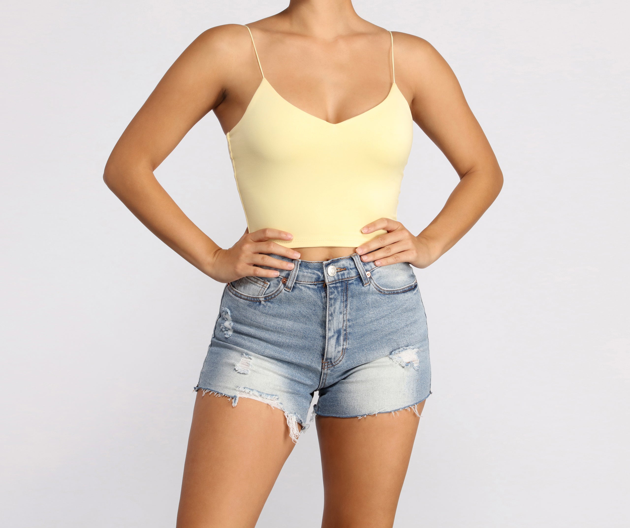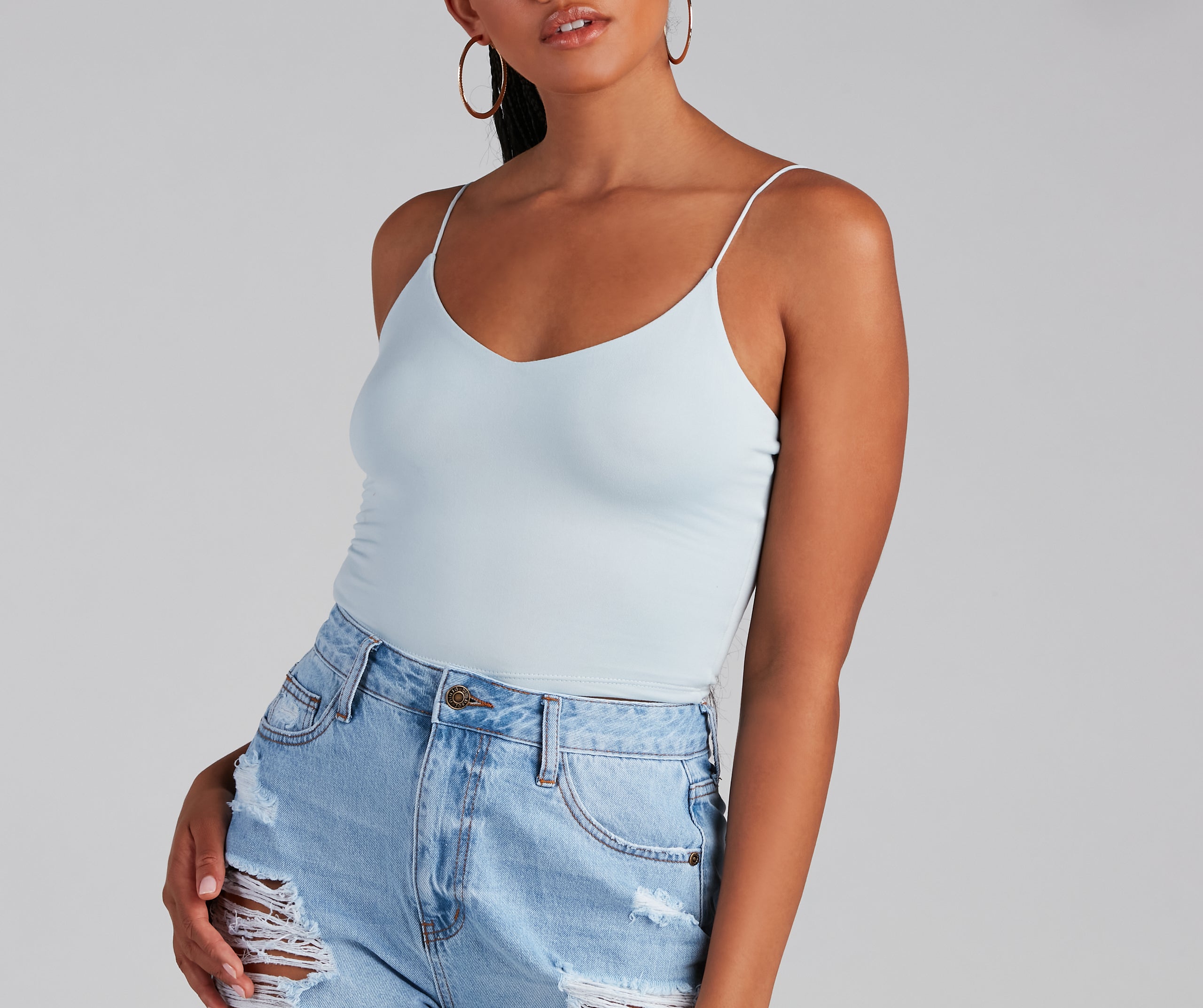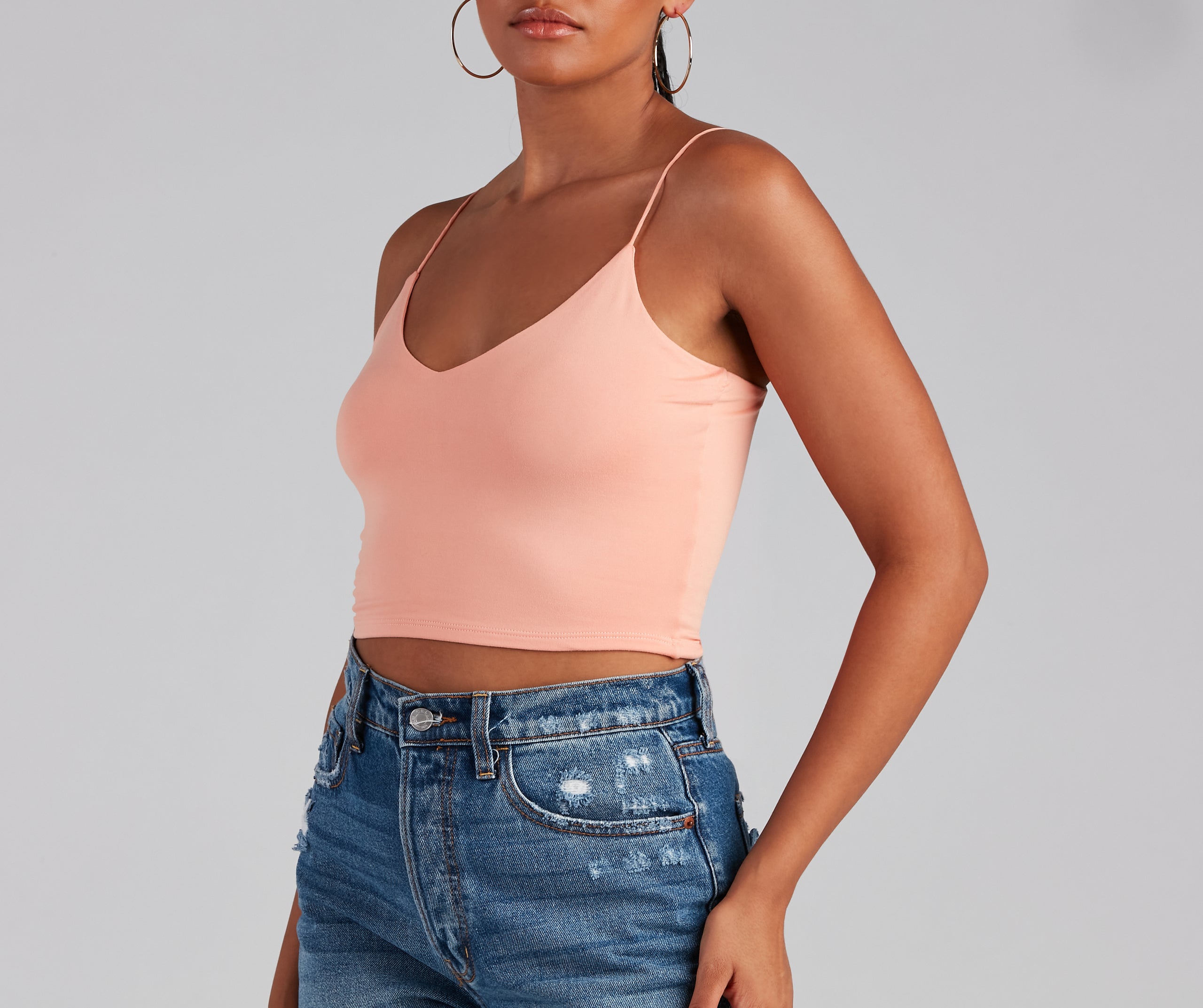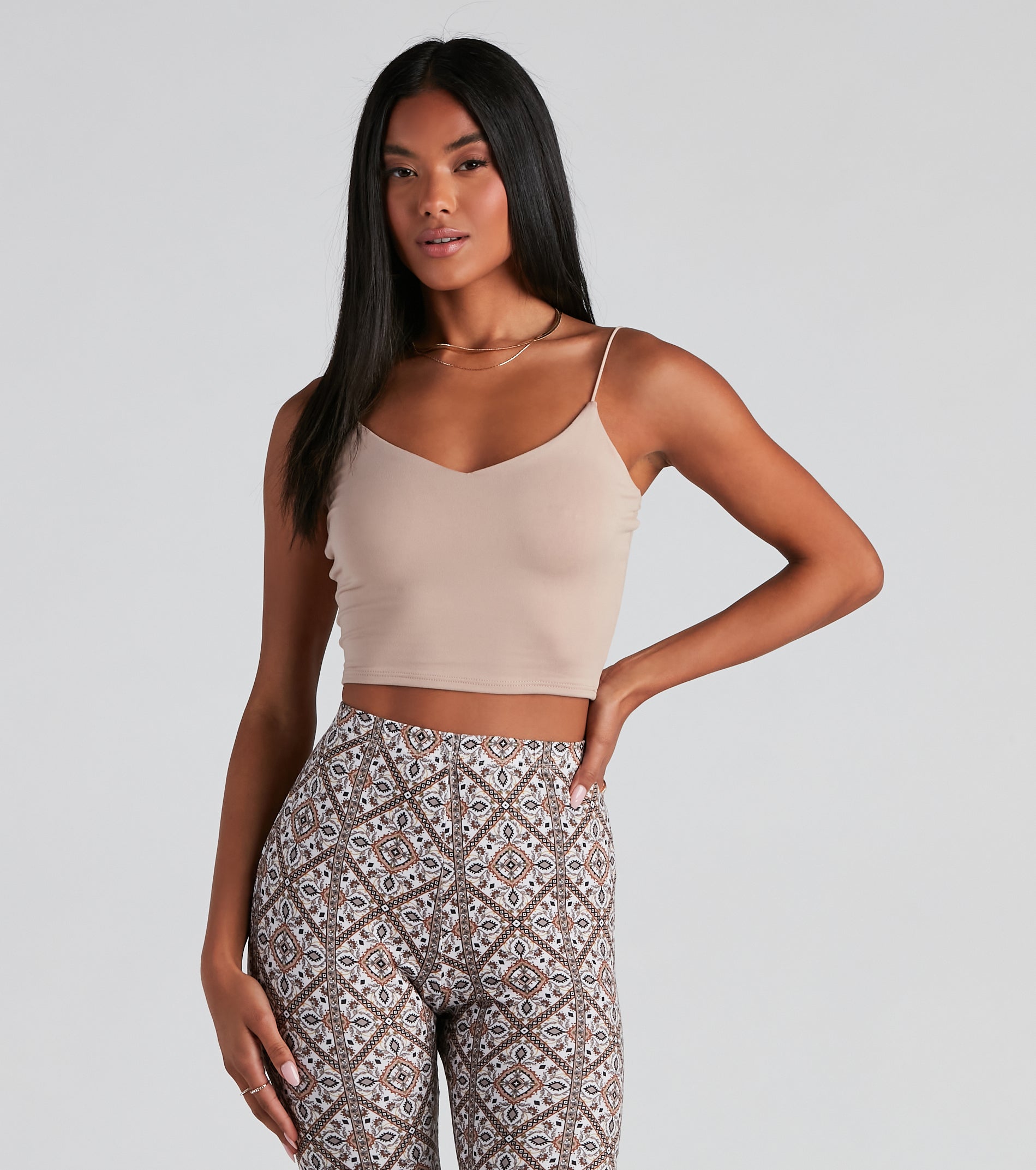 Layer on the style in this elevated basic cami top. This crop tank top features dainty elastic straps for a sweet feminine look to go with the faltering subtle V-neckline. This layering tank top is made of super soft and smooth knit fabric that shapes and forms your curves for a comfortable fit that you can easily wear from day to night. Style this essential sleeveless crop top under a blazer for a polished look or pair it with parachute pants for a casually chic ensemble.