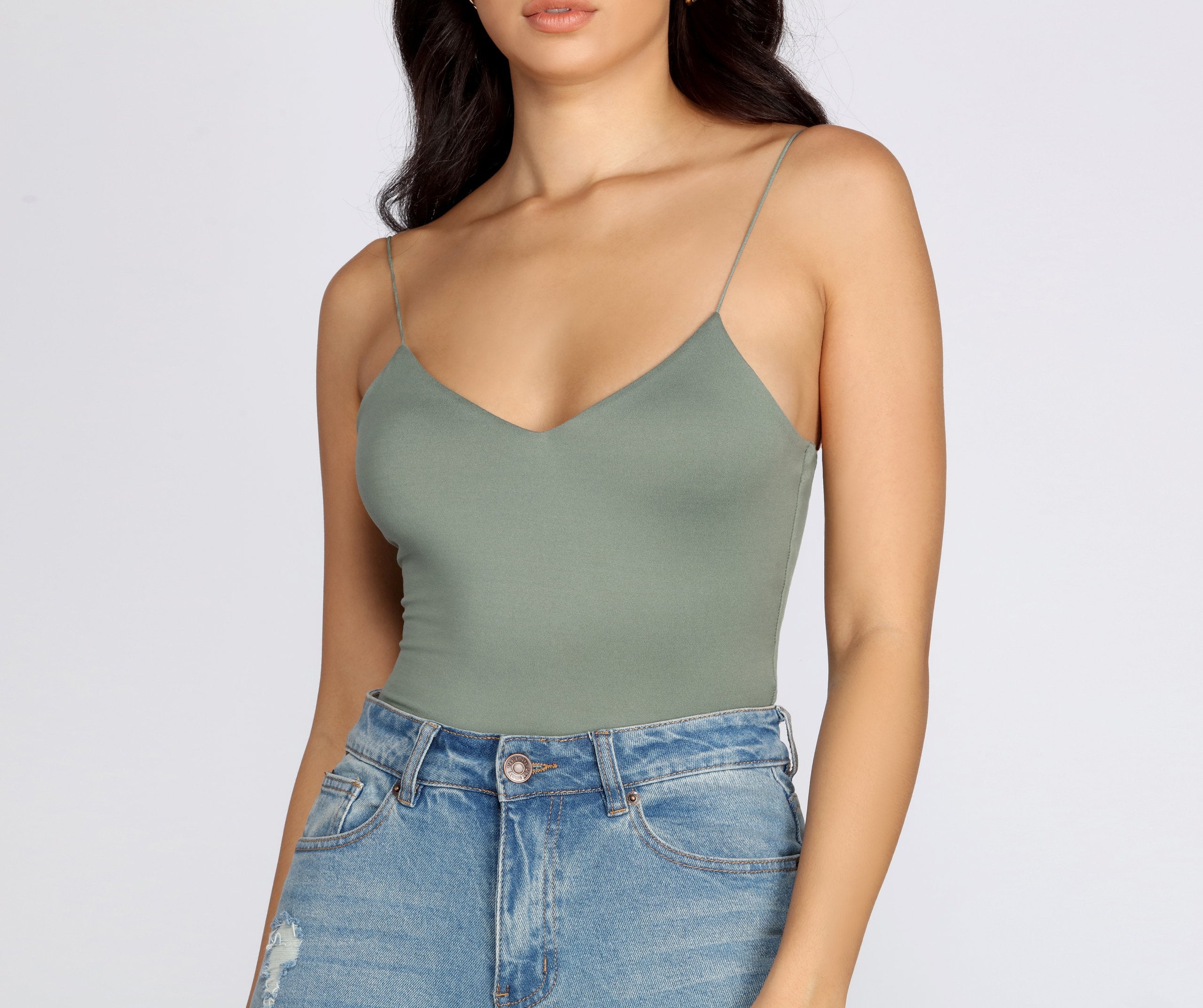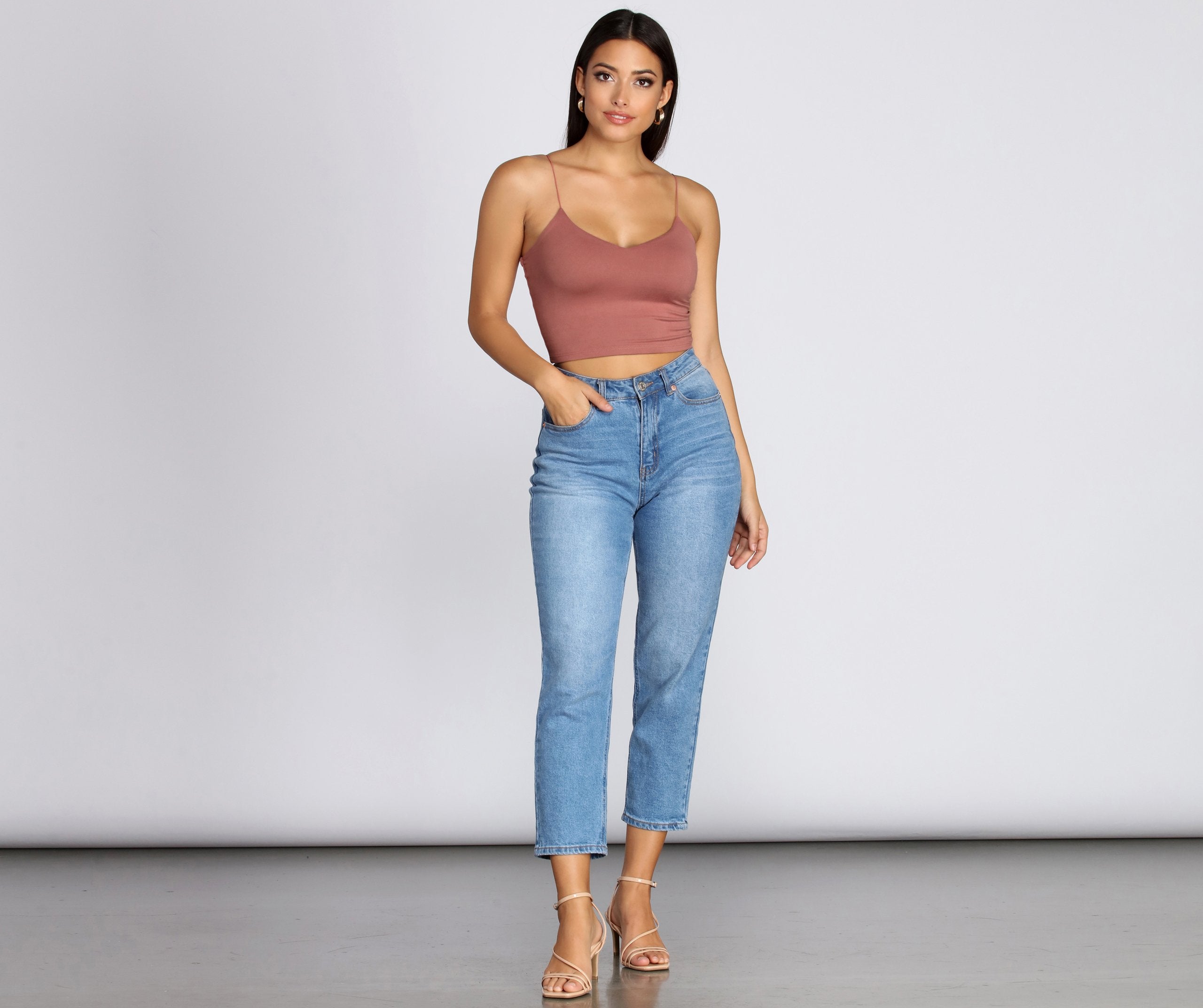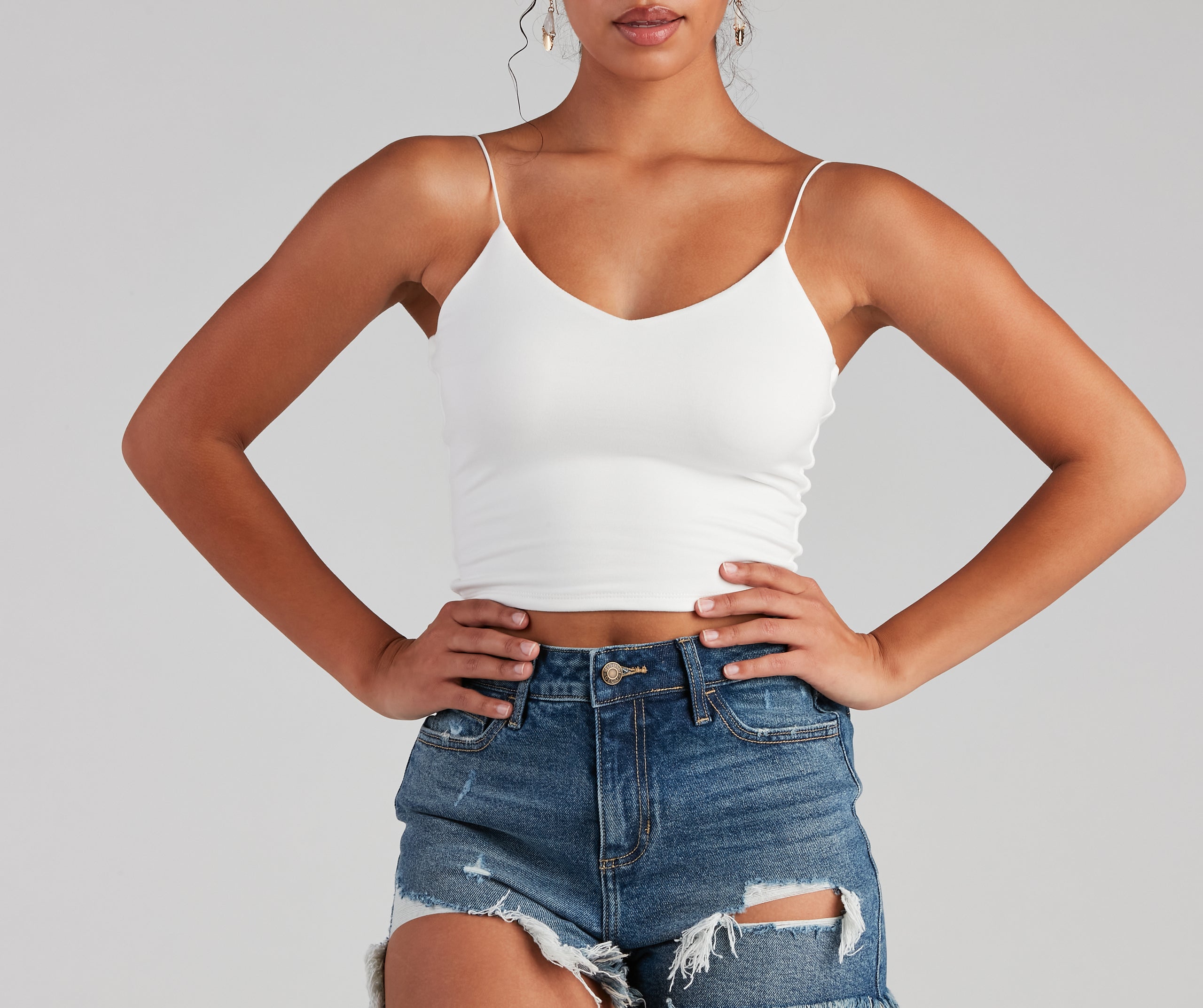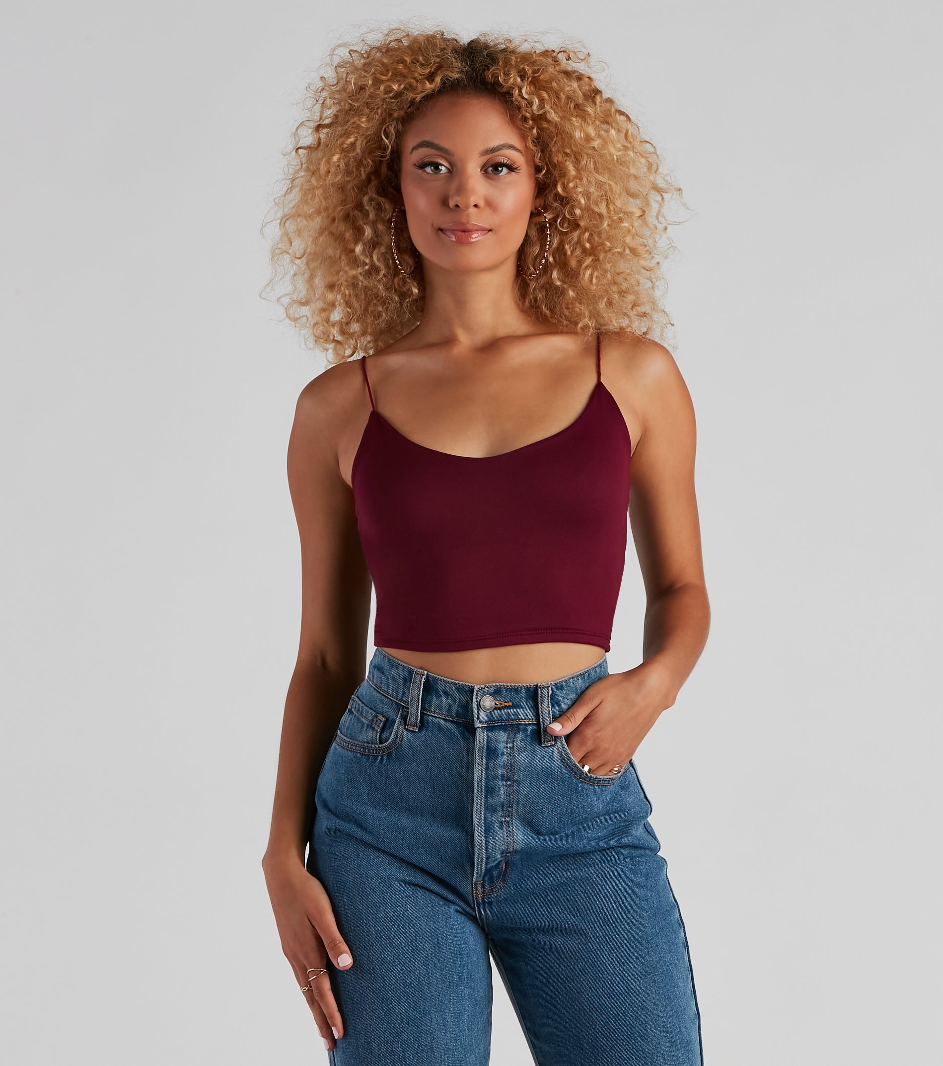 Layer on the style in this elevated basic cami top. This crop tank top features dainty elastic straps for a sweet feminine look to go with the faltering subtle V-neckline. This layering tank top is made of super soft and smooth knit fabric that shapes and forms your curves for a comfortable fit that you can easily wear from day to night. Style this essential sleeveless crop top under a blazer for a polished look or pair it with parachute pants for a casually chic ensemble.