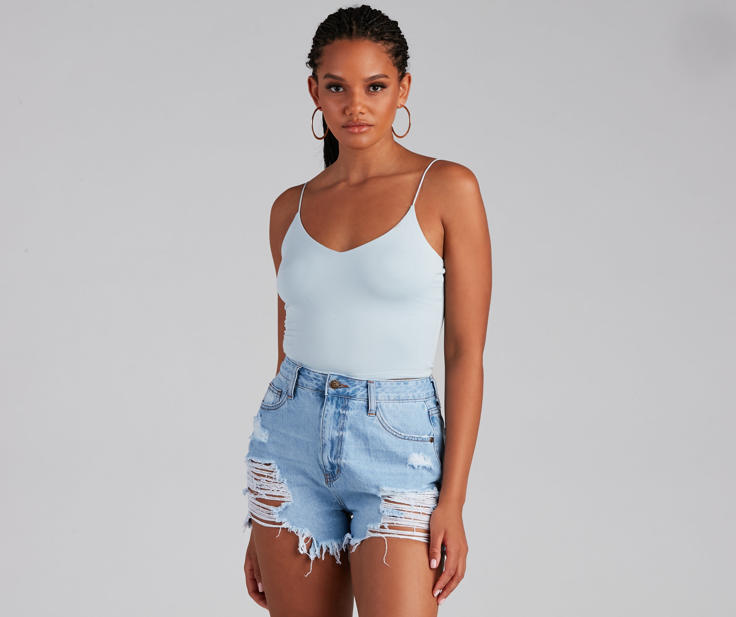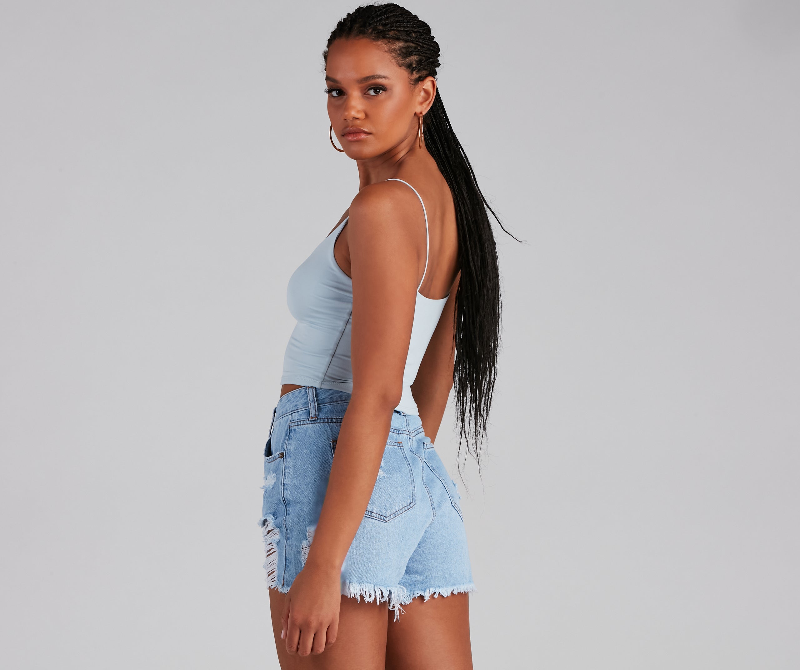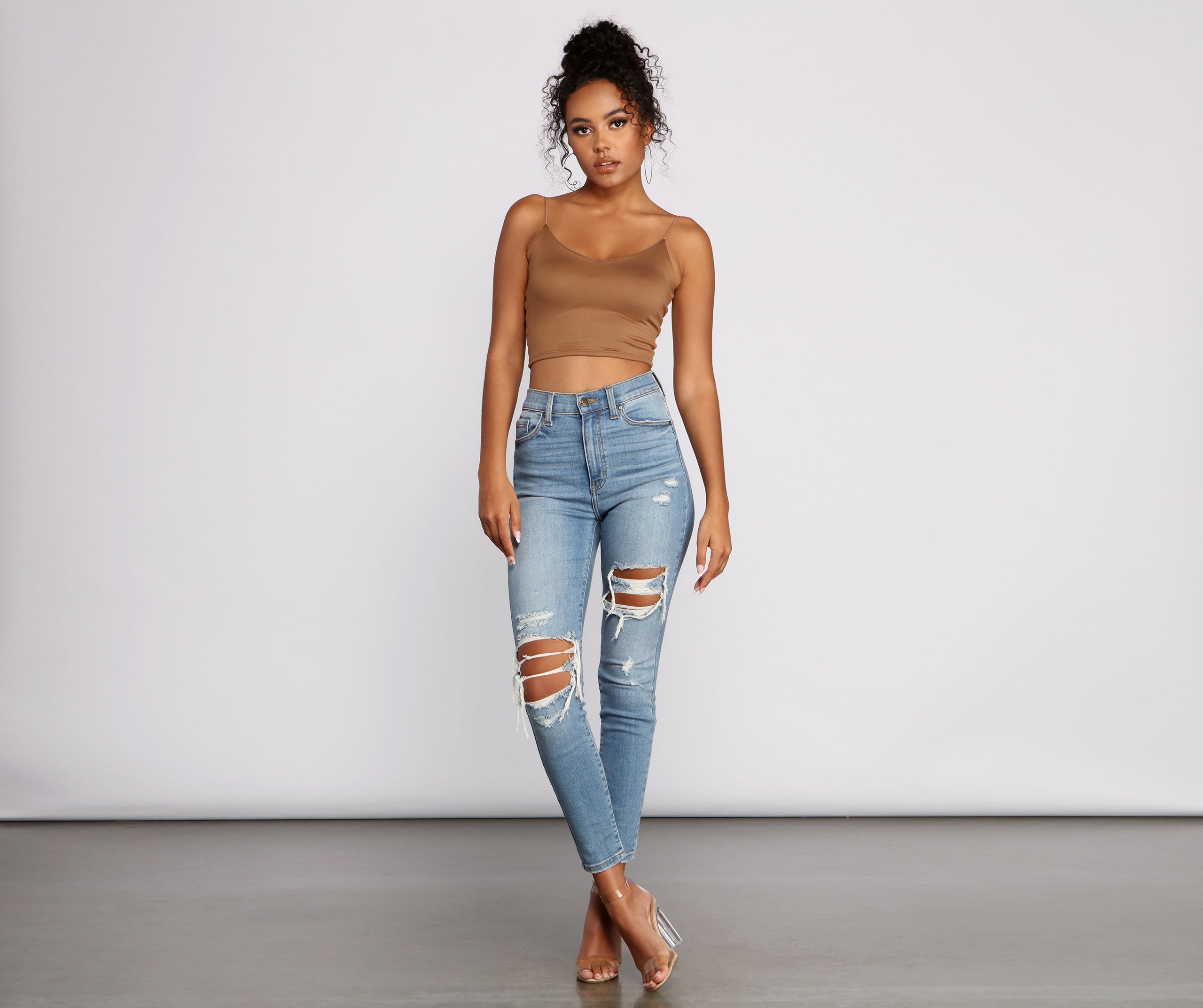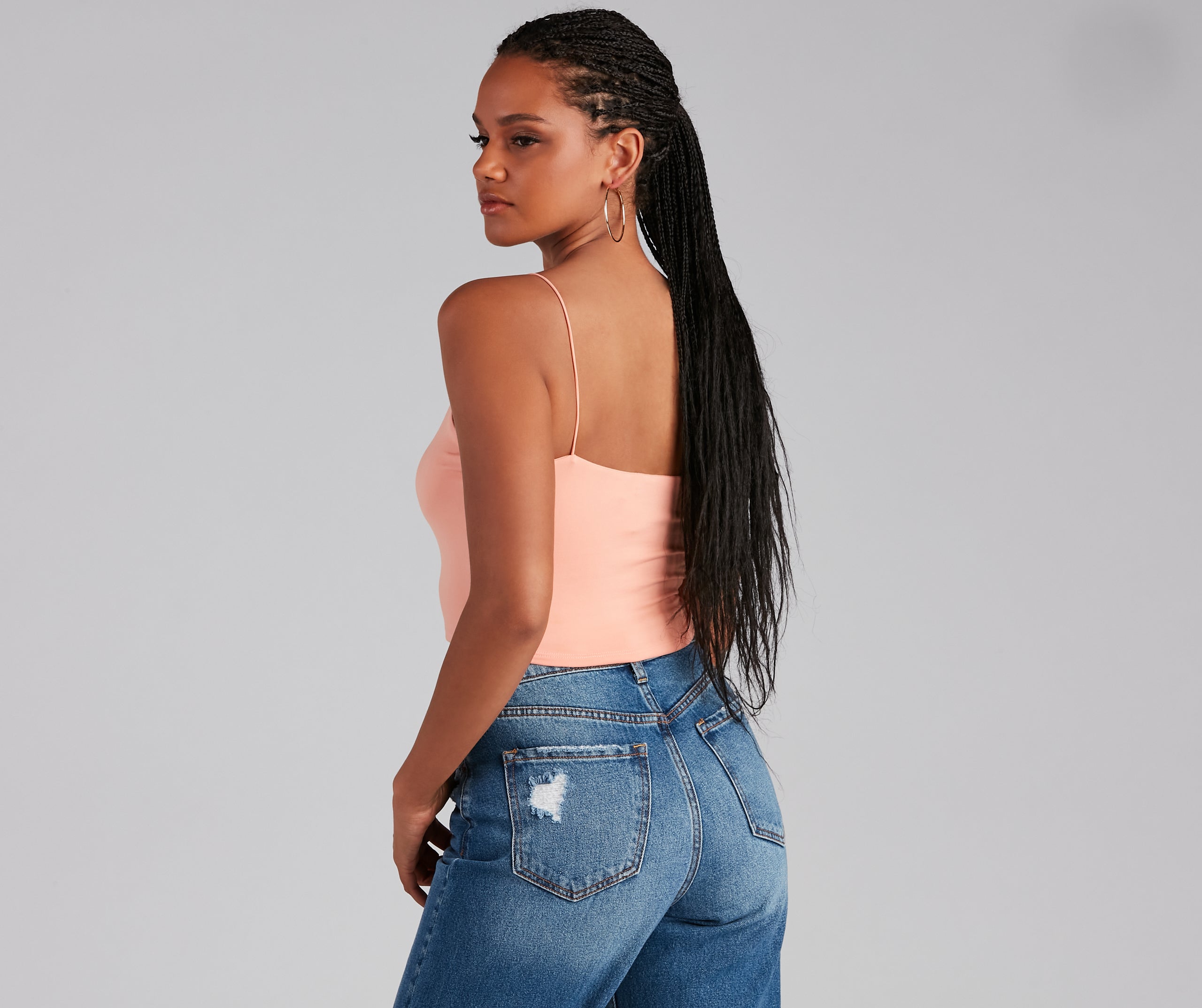Layer on the style in this elevated basic cami top. This crop tank top features dainty elastic straps for a sweet feminine look to go with the faltering subtle V-neckline. This layering tank top is made of super soft and smooth knit fabric that shapes and forms your curves for a comfortable fit that you can easily wear from day to night. Style this essential sleeveless crop top under a blazer for a polished look or pair it with parachute pants for a casually chic ensemble.