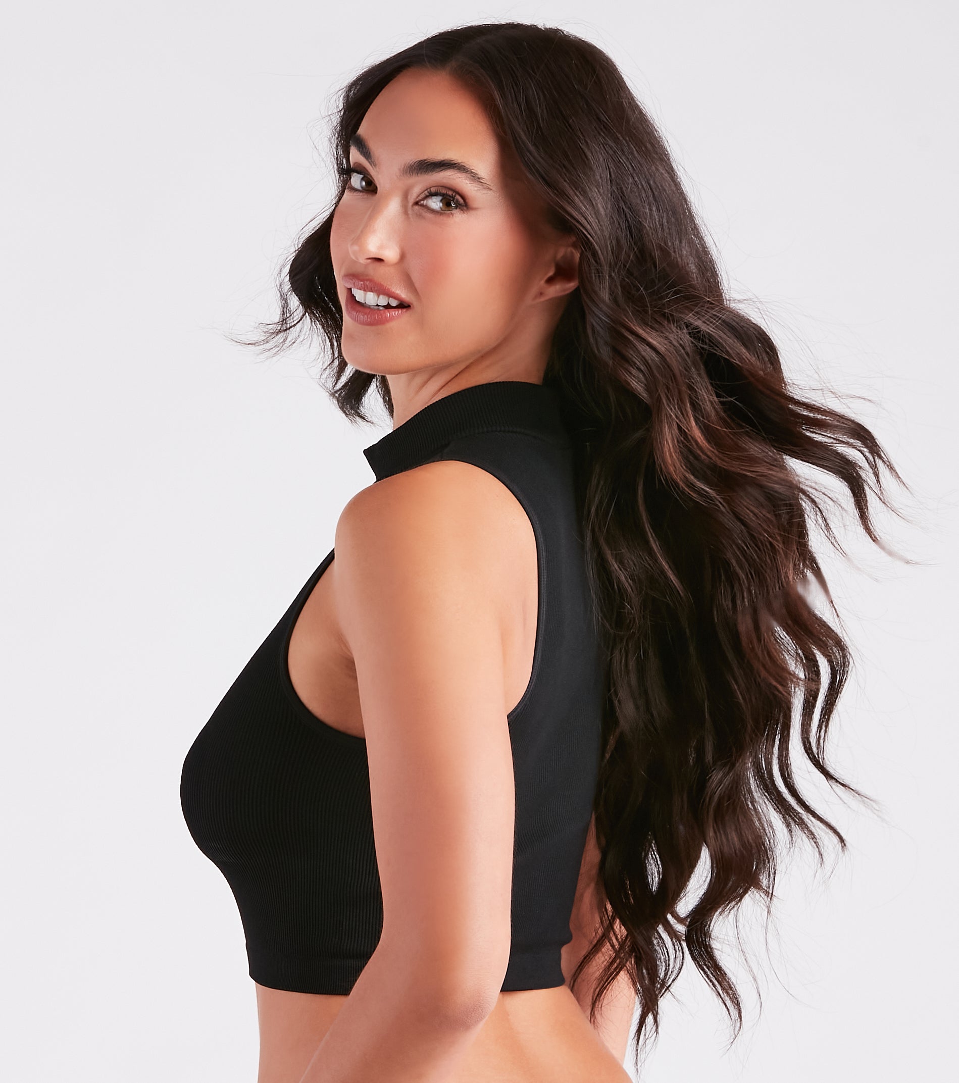 This smooth and seamless mock neck bra top is an iconic staple you need in your lineup. It features a sleeveless mock neckline with tank shoulder straps and a fitted cropped hem. The seamless rib knit fabric offers plenty of stretch for comfortable wear. Style with your fave leggings and sneakers for a cute athleisure look.