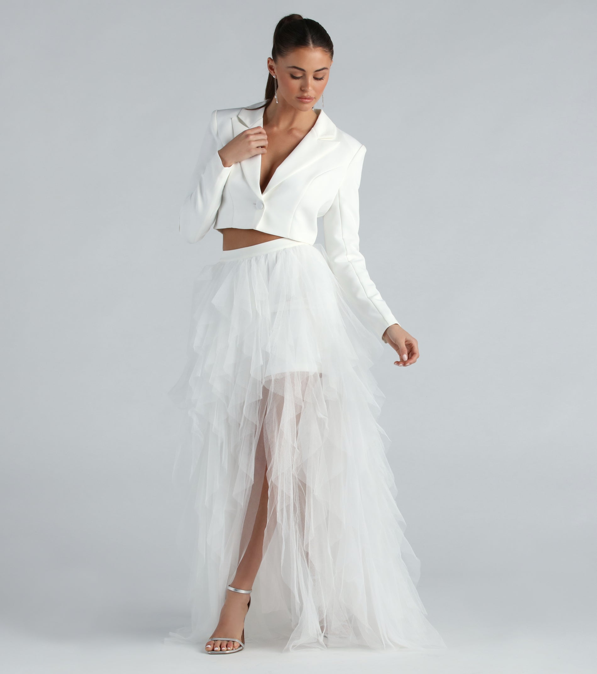 It’s double the fun with the Korrie formal maxi skirt to showcase your fashionista at Homecoming! She features a high-rise waist, a voluminous tiered ruffle maxi-length silhouette, a sultry high front slit to show some leg, and a floor-length hem. The long skirt is composed of a tulle mesh fabric with a stretchy knit short lining. Style with the matching blazer and platform heels for a school dance or red carpet event!?