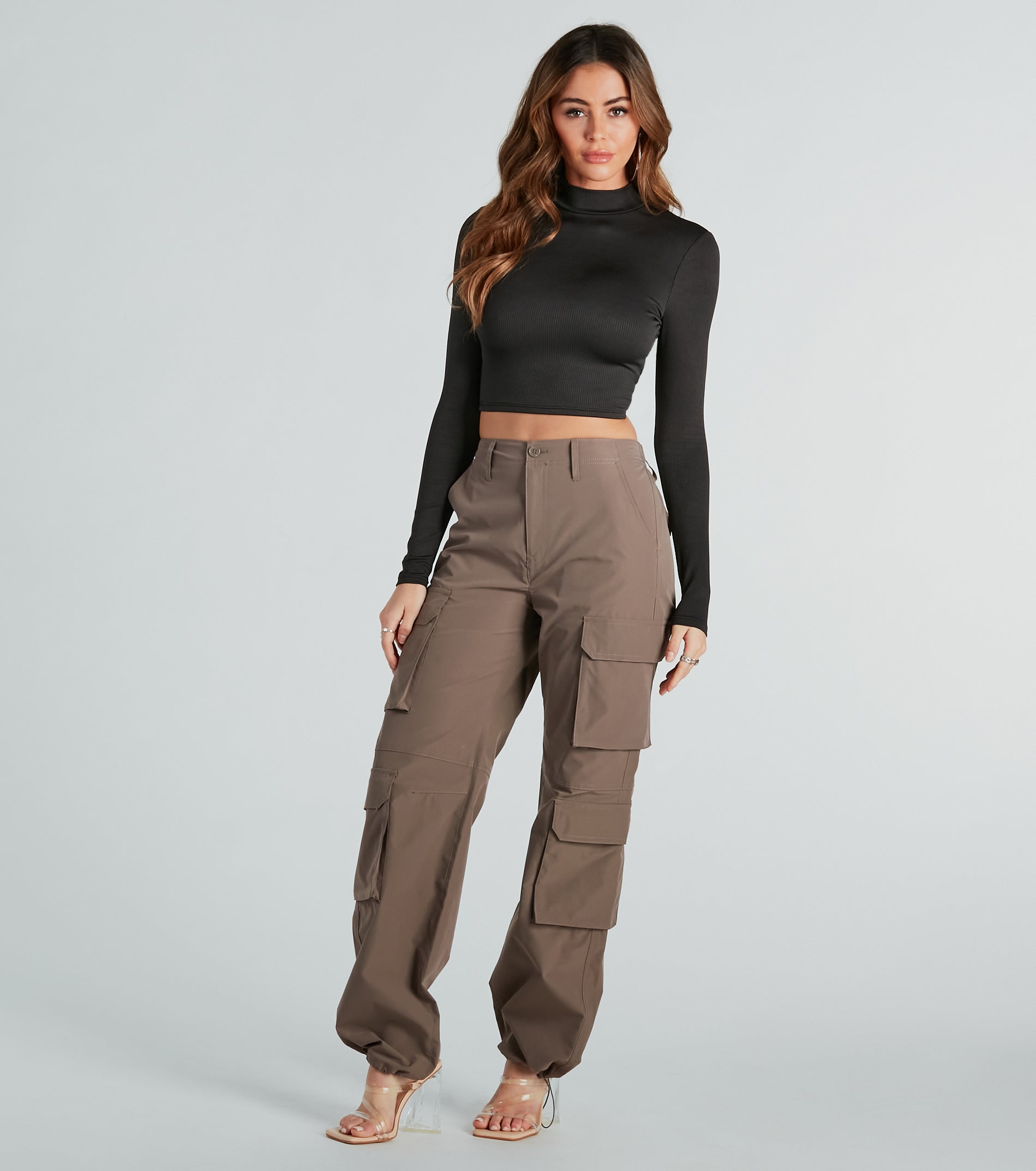 Keep it cute in this crop top for your upcoming plans! It features fitted long sleeves, a mock neckline, a cropped hem, and a flirty open cutout back with tie closure on smooth rib-knit double-lined fabric. Style with trendy cargo joggers for an edgy fashion look!