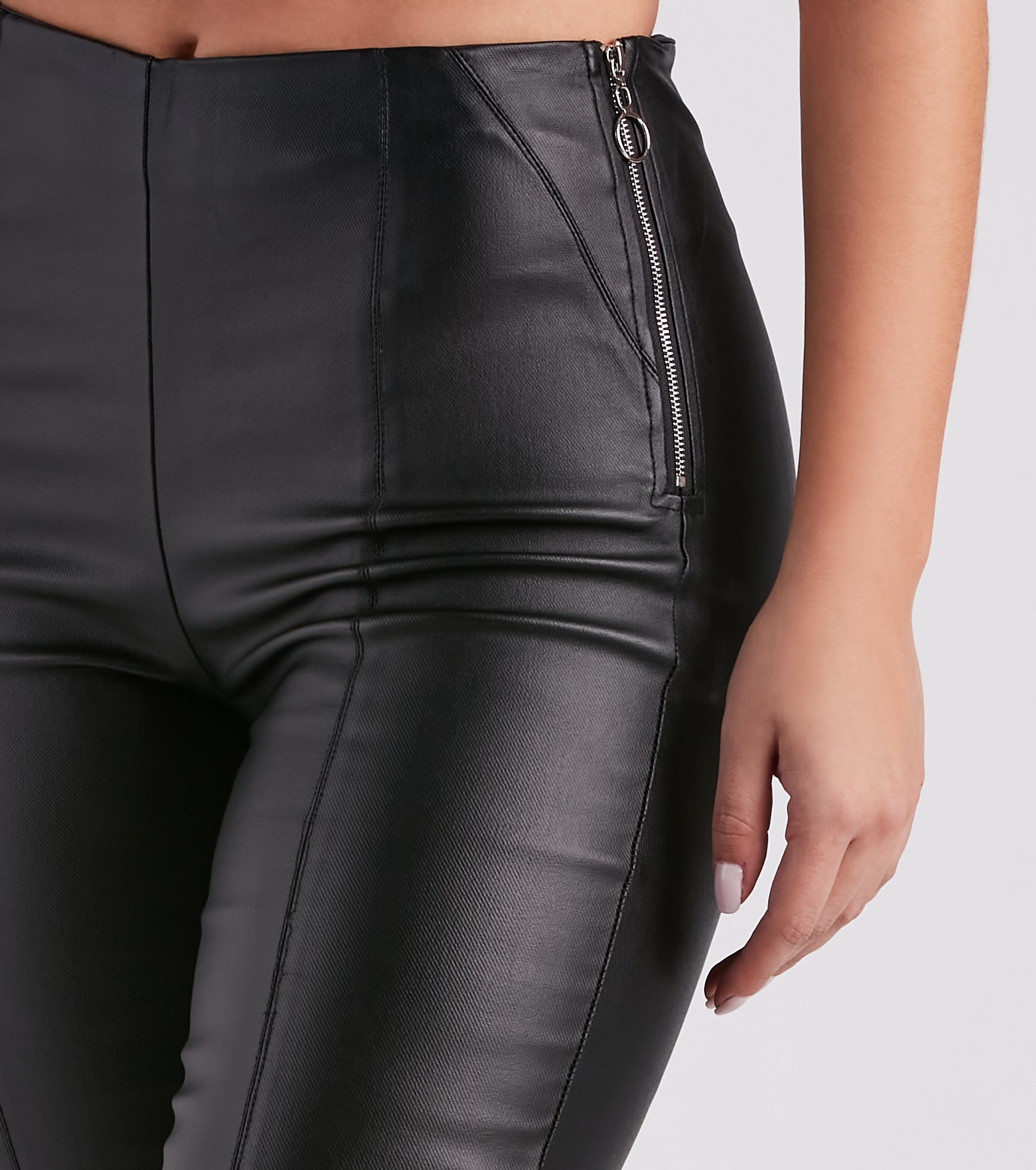 You know where all the top spots to be seen in these coated faux leather pants are! They feature a mid-rise waist, side zipper, and hook-eye closure, front exposed seam detailing along the skinny-leg design. Style with heeled mules to complete the look!