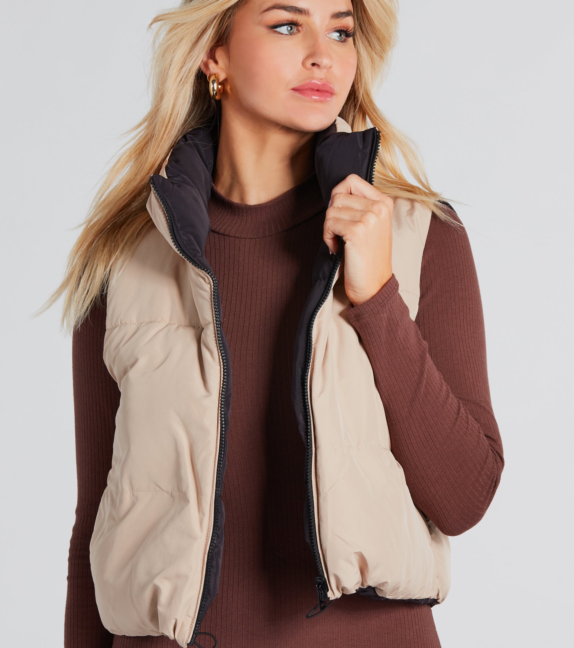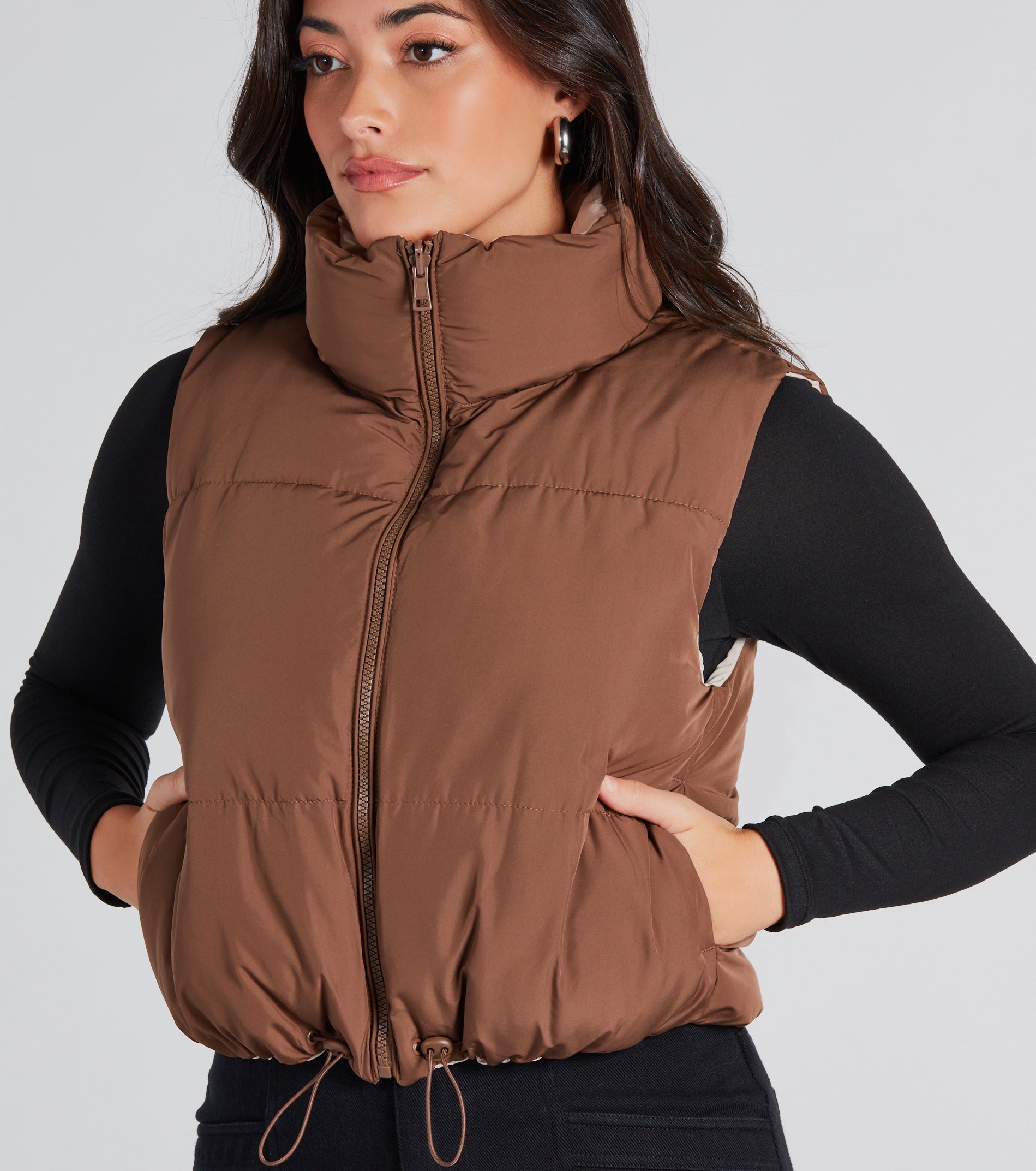 This puffer crop vest lets you pick your mood for the day! Layer on a comfy and cute style with this reversible vest featuring a sleeveless standing collar neckline, a front zipper closure, hidden side pockets for keeping your hands warm, and an adjustable drawcord hem. The puffer vest is crafted from an insulated woven-lined fabric that helps keep you warm and protected. Style over a basic lounge jumpsuit for grabbing coffee and errands!