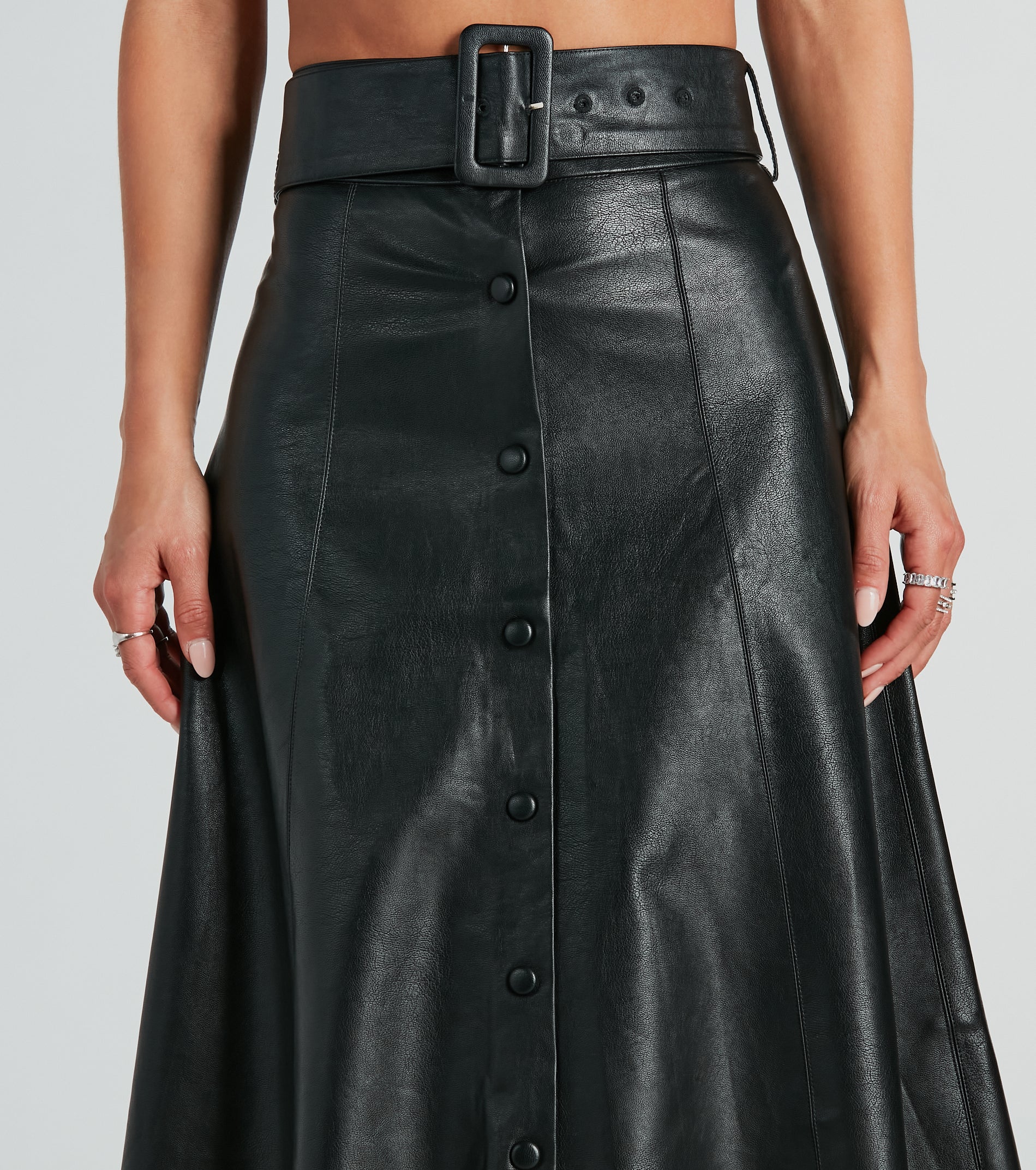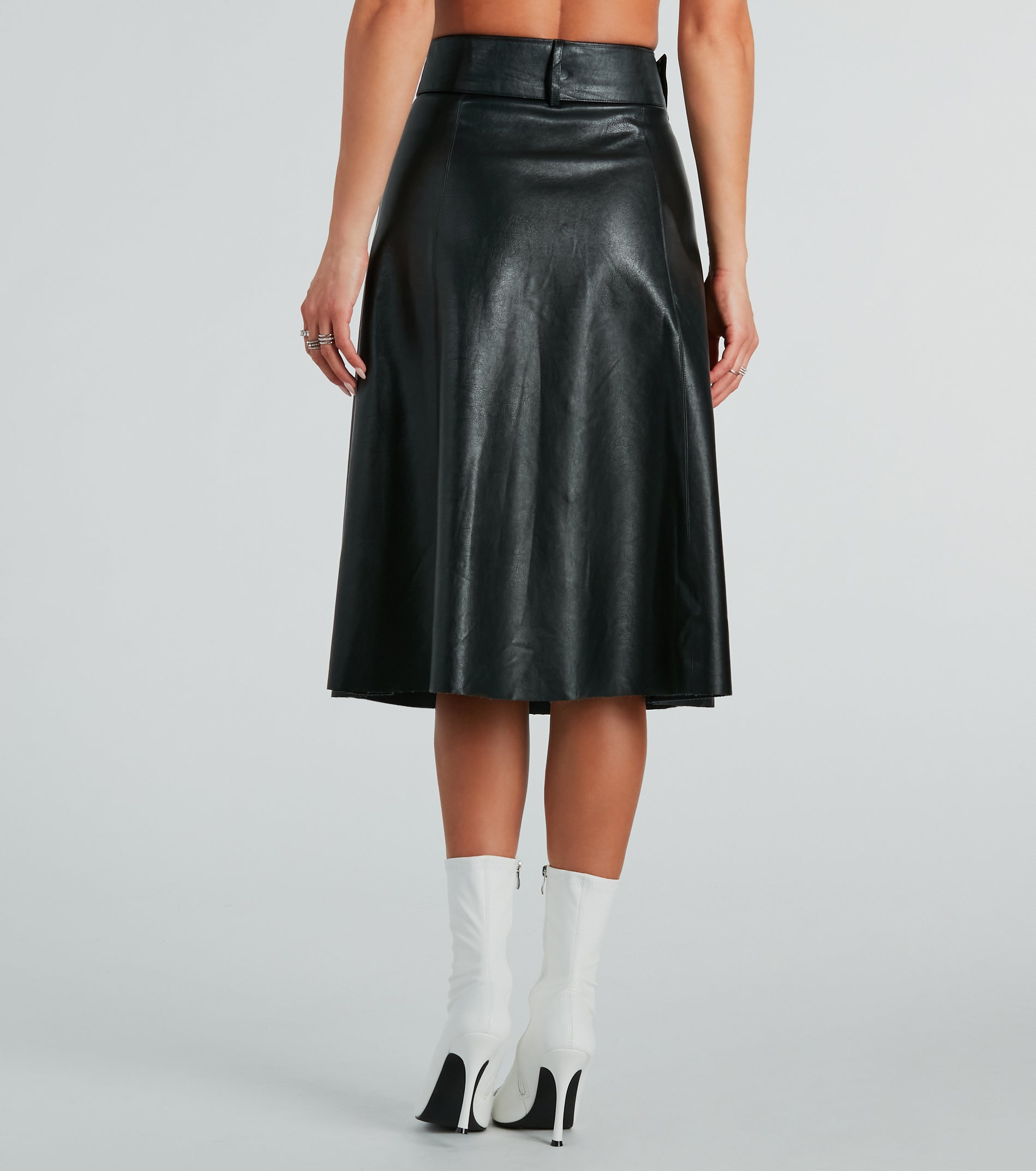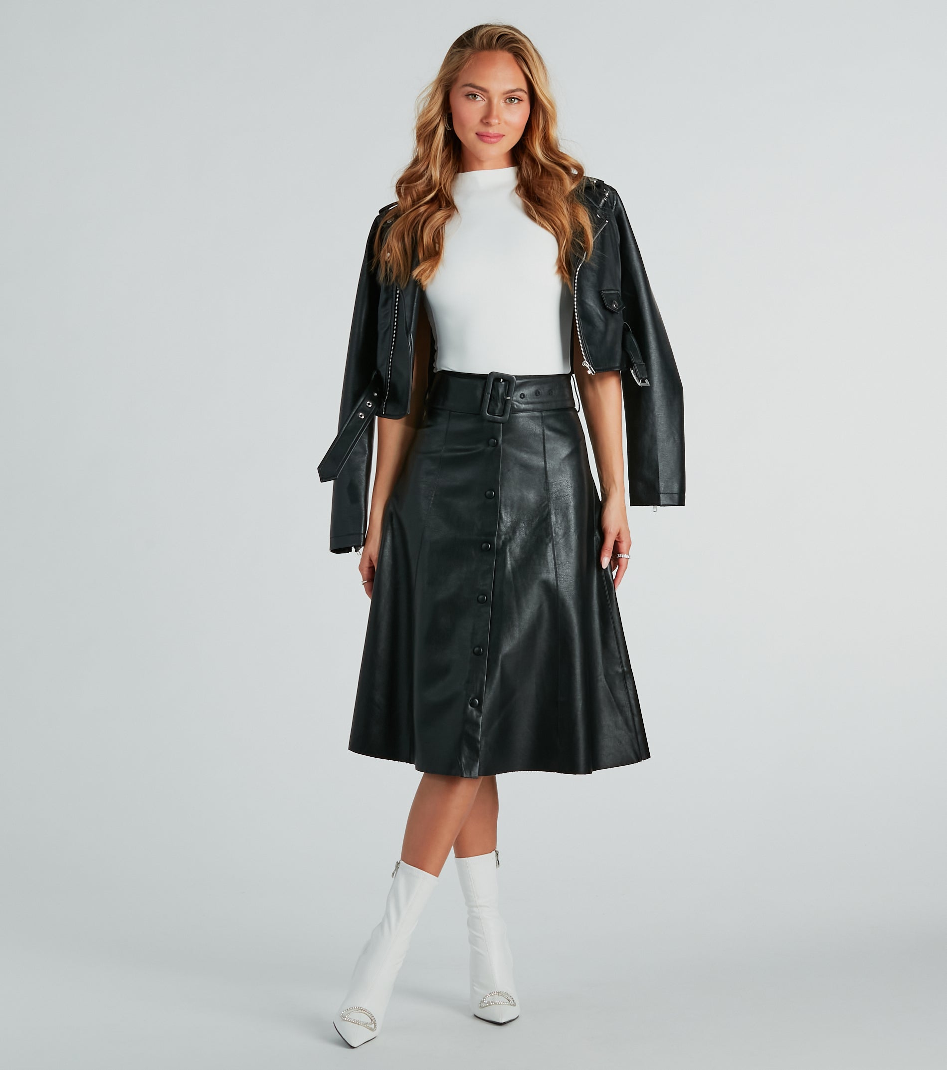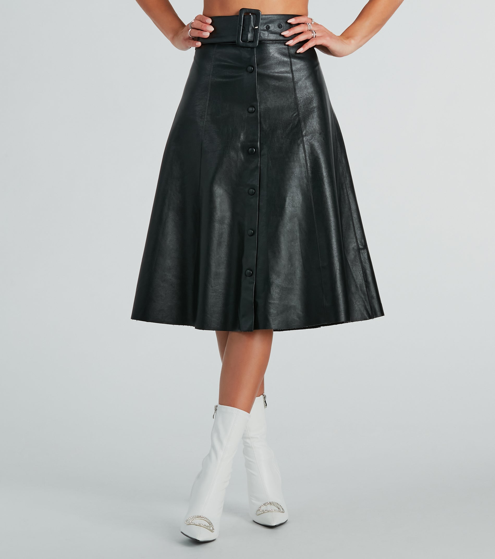 For the girl on the go, look sleek and classy in this faux leather midi skirt everywhere! The midi-length skirt features a high-rise belted waist, belt loop accents, a front button-down design, and a flattering A-line silhouette. Complete the look in a faux leather jacket and booties for a chic style!