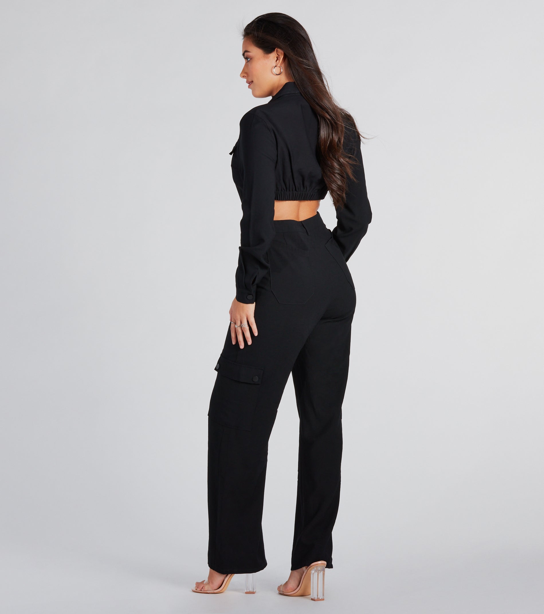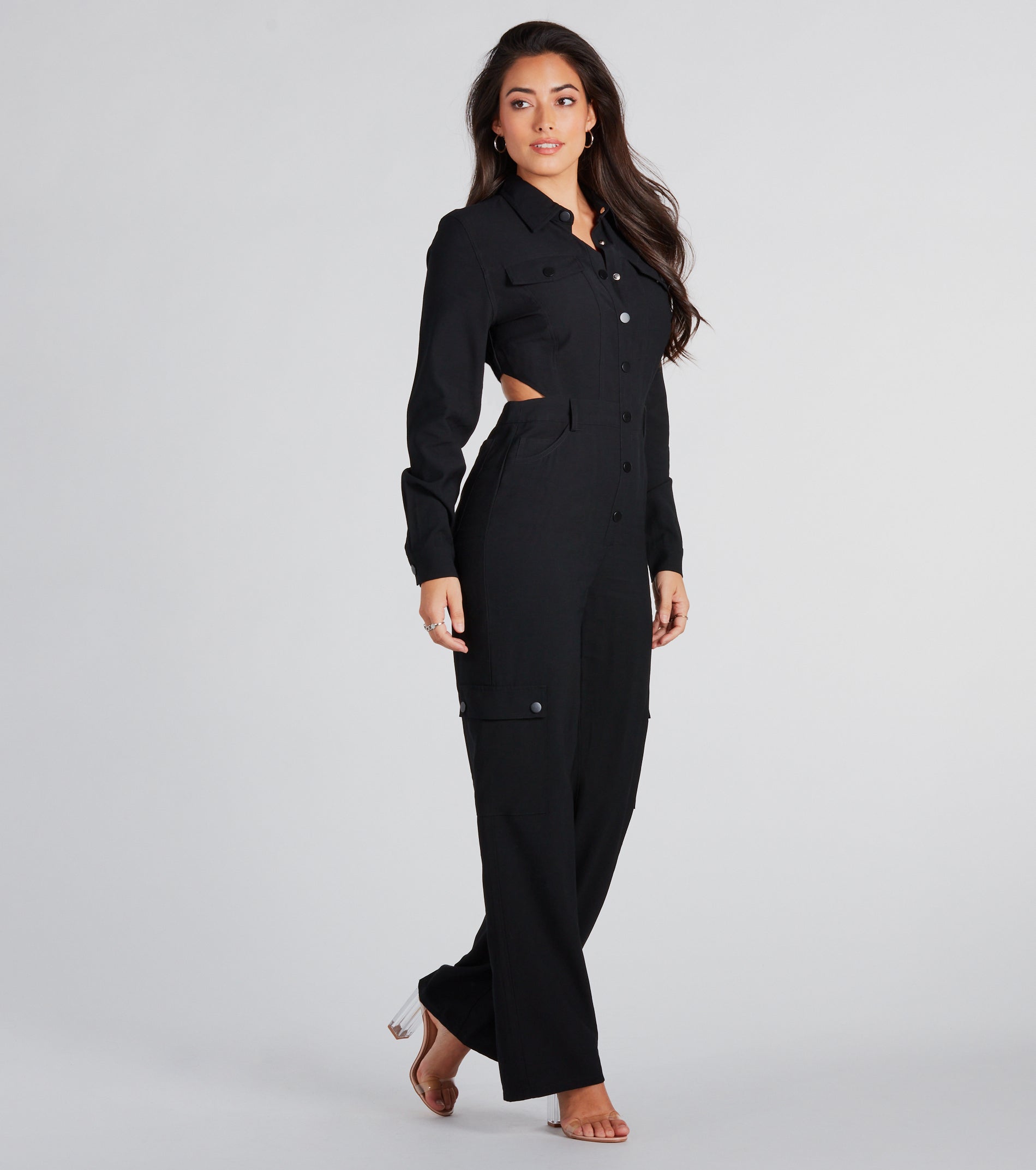 Say yes to fun in this woven jumpsuit for the perfect outfit for whatever the day brings! It features long sleeves with snap-button cuffs, a collar neckline, and an open-back design. The front snap-button down closures, faux flap pockets, belt loop accents, and five-pocket styling make it oh-so-fashionable. A wide-leg silhouette and flap pockets with snap button closures.?Complete the look with simple hoop earrings.