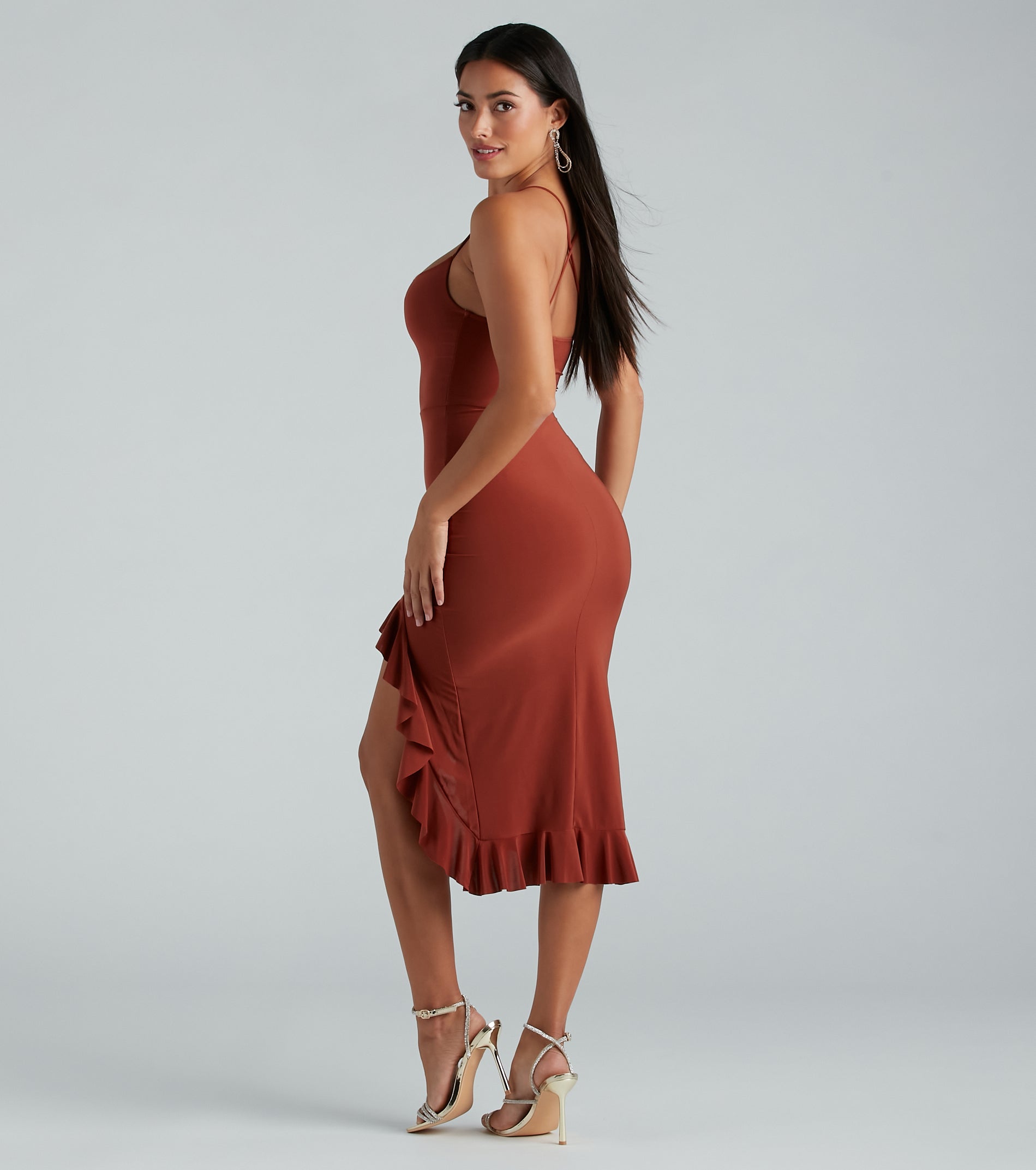 Whether you’re in the city for a soiree or at a dinner party, this midi dress makes every moment feel perfect! It features a sleeveless cowl neckline, spaghetti straps that crisscross along the back, a form-hugging silhouette, and a ruffle trim hem with a slit design. Complete the look in strappy block heels and a choker.