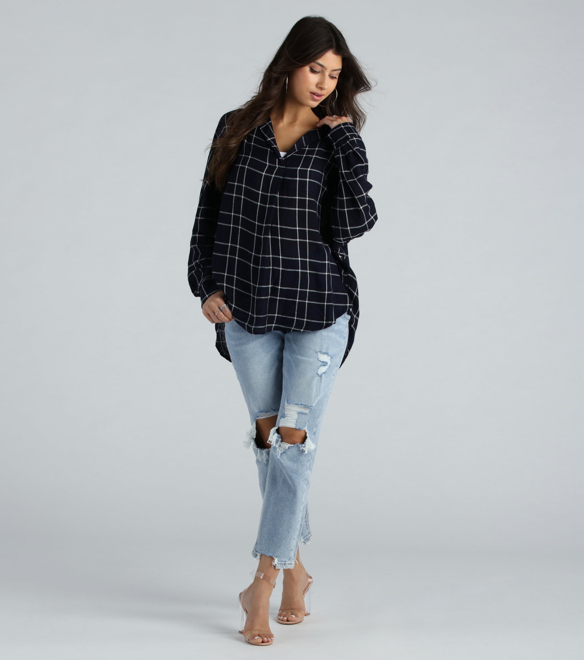 Embrace a seasonal chic style in this plaid?top perfect for coffee runs to casual dates! The top features slouchy long sleeves with button cuffs, a collar V-neckline, and an oversized silhouette on woven fabric with a trendy plaid print. Complete the look in distressed denim.