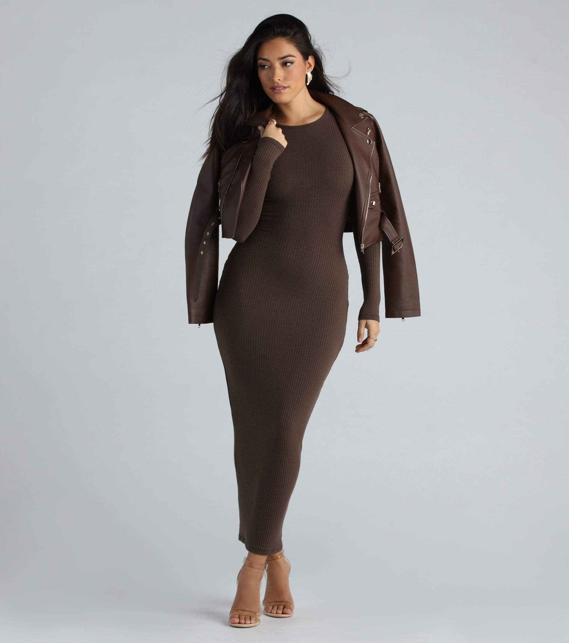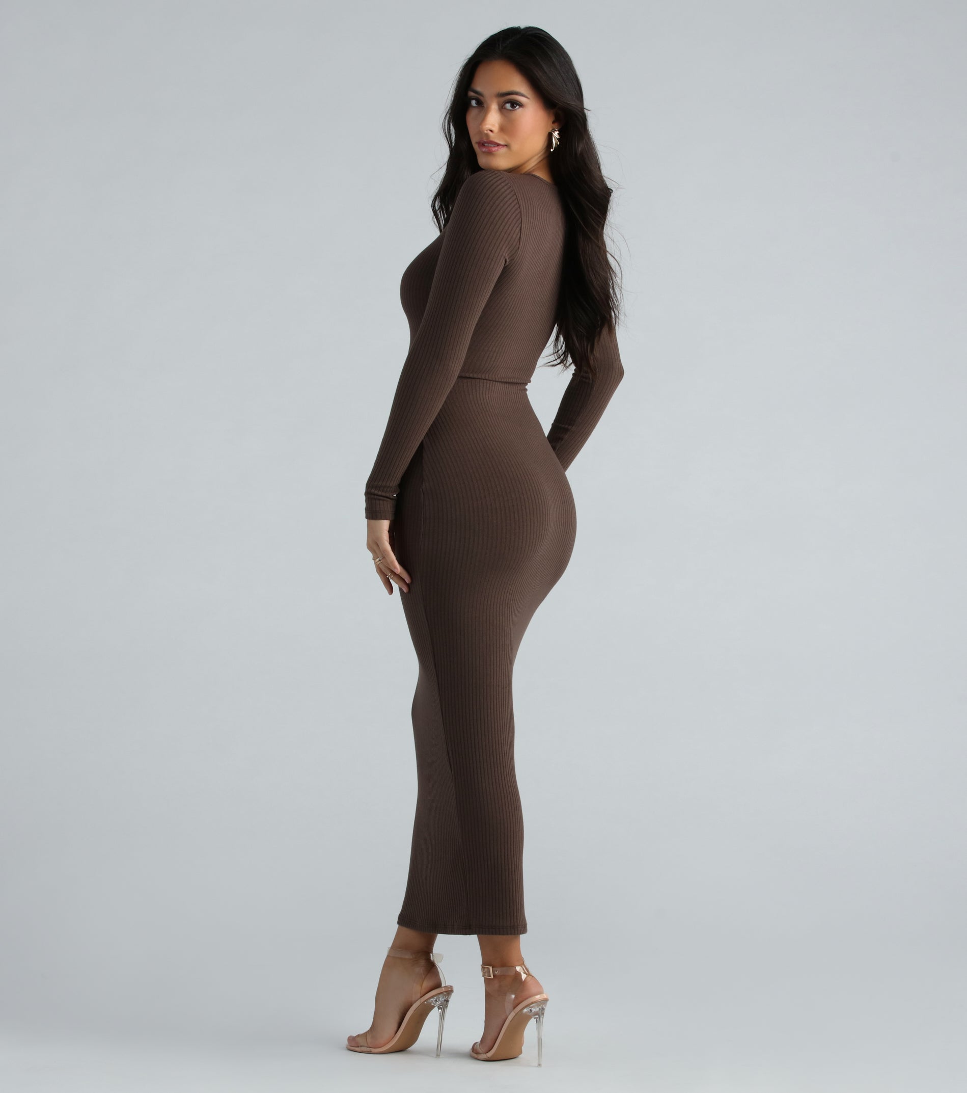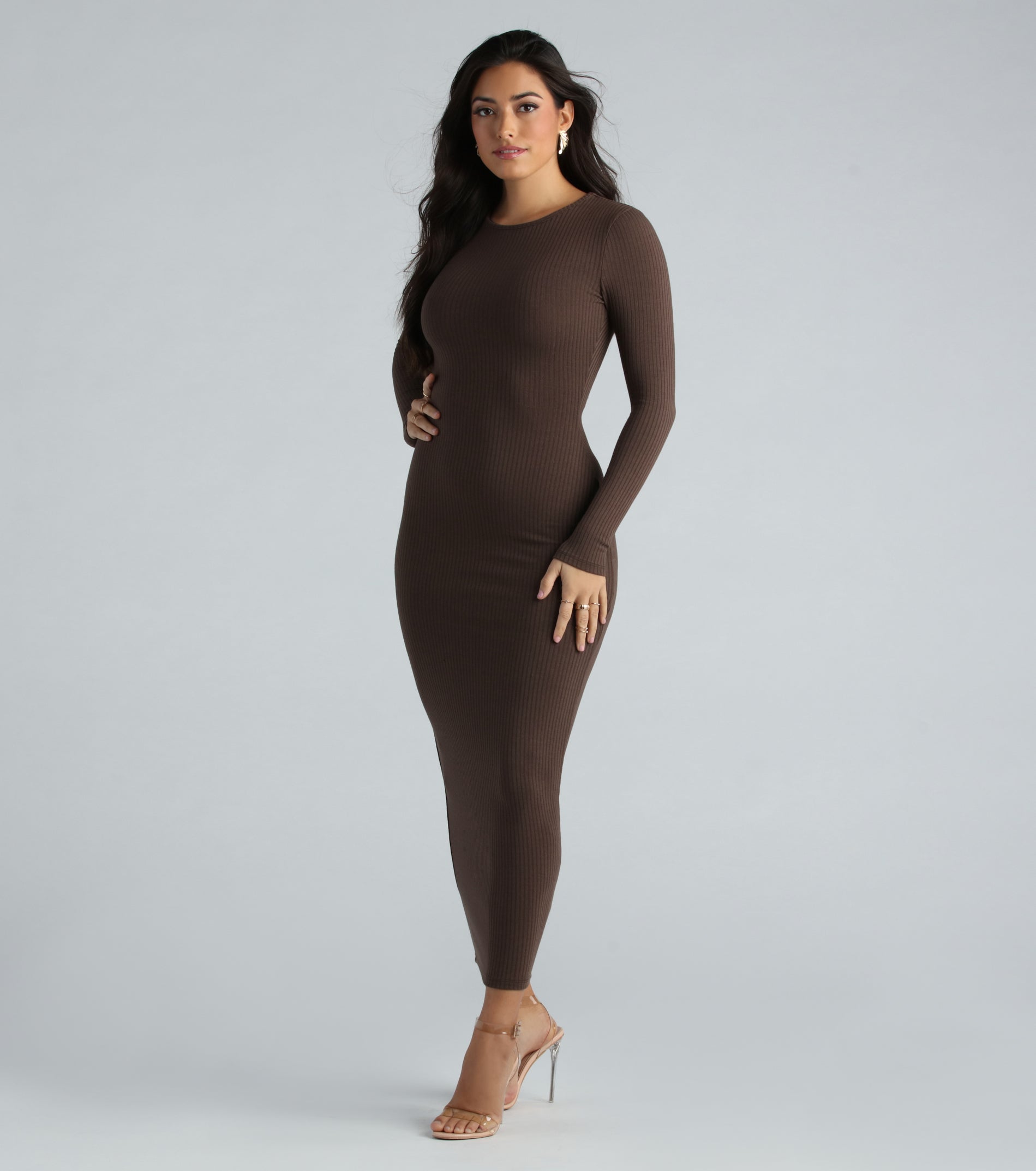 Put your curves on display in this basic maxi dress perfect for dressing up or down! the long dress features fitted long sleeves, a classic crew neck, and a flattering bodycon silhouette on hacci rib knit fabric. Complete the look in strappy heels and a purse!