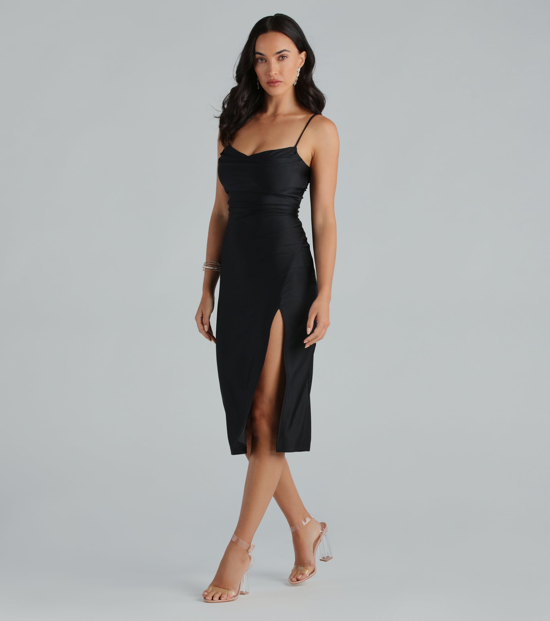 Simple and sleek, this smooth knit midi dress is a perfect choice. It features a sleeveless?cowl neckline, spaghetti straps, a high waist seam, a fitted, A-line silhouette, and a chic high front slit to showcase some leg. Style with embellished statement earrings for a cocktail party.