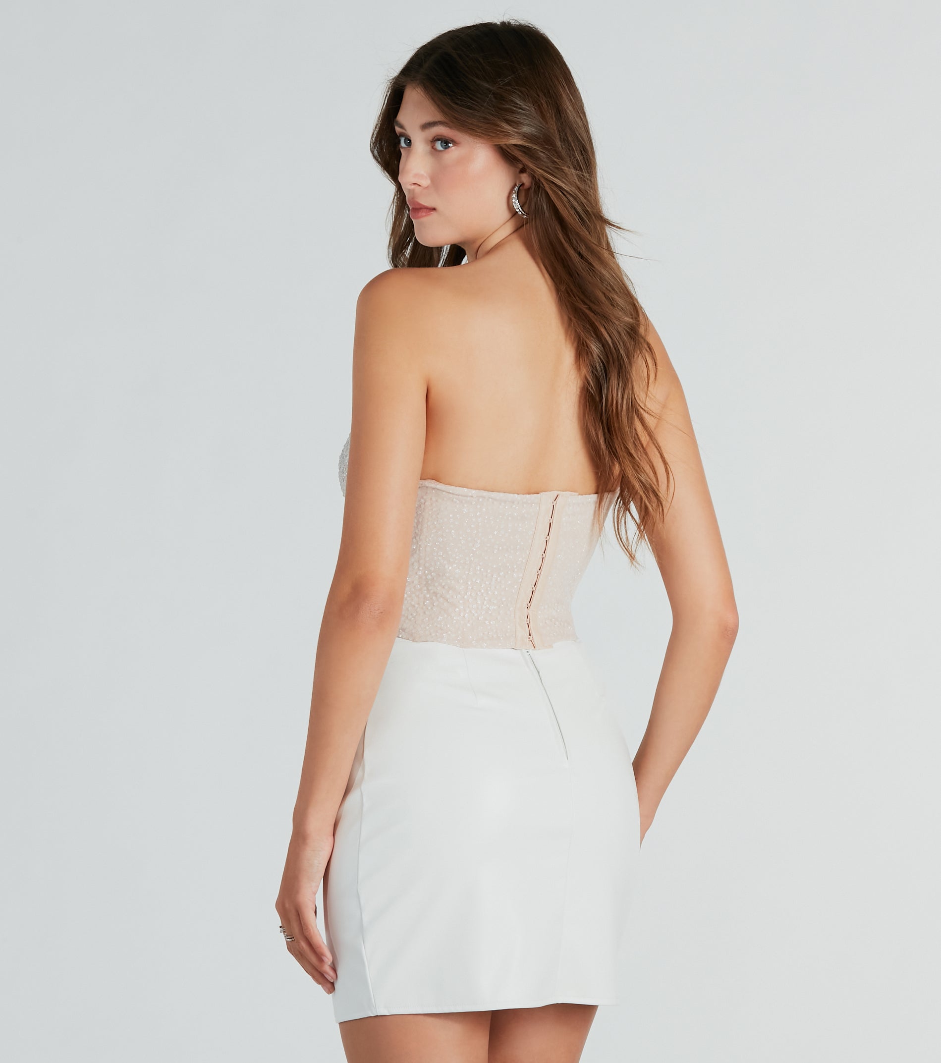 This gorgeous bustier makes for a glam surprise guest at parties!?The sweetheart neckline and built-in padded underwire bust flatters and supports while the detachable and adjustable straps provide a perfect fit. This bustier crop top has finishing touches with front rhinestone embellishments, flexible boning, and a unique back with tulle glitter polka dots and multiple hook and eye closures. Complete the look in boyfriend jeans and mules!