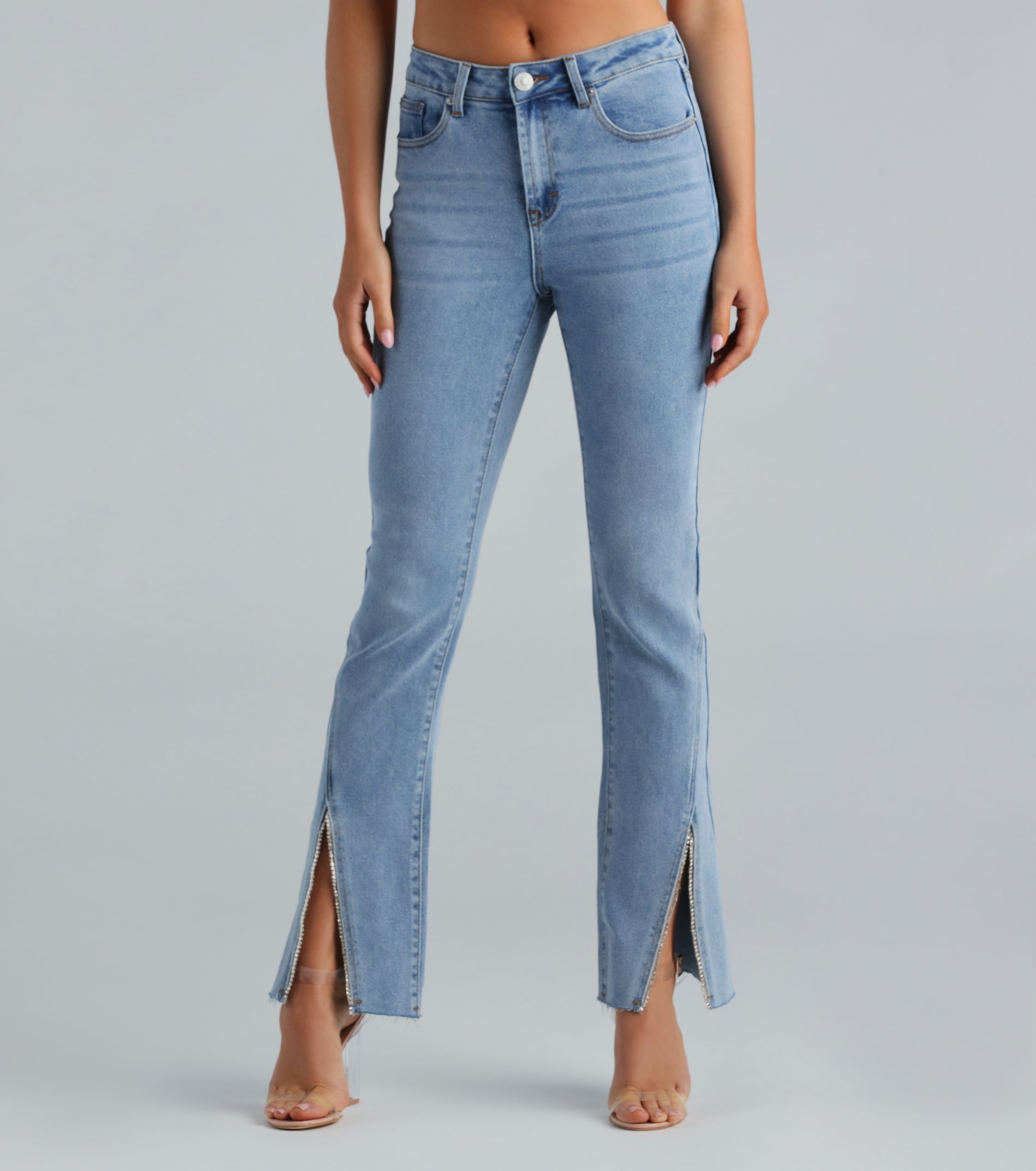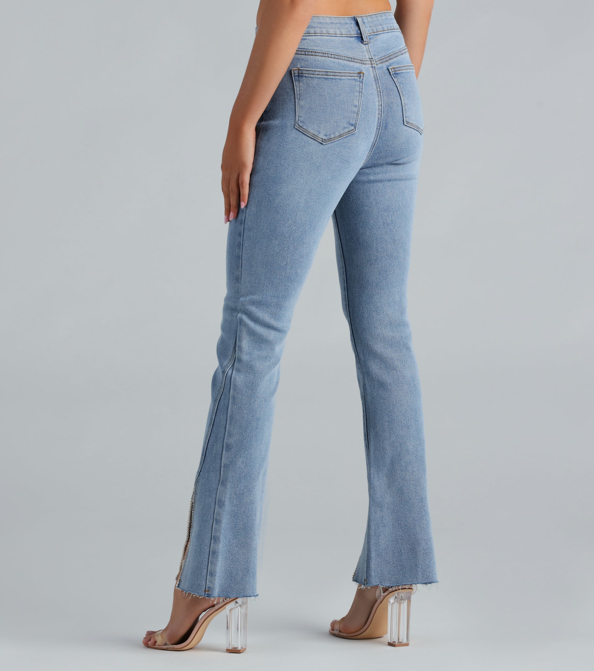 Give yourself the glam treatment in these high-rise denim jeans! They feature a flattering high-rise waist, a hip-hugging fit, and a flared hem with an asymmetrical seam that leads to a center slit with rhinestone trim. The jeans are crafted from medium-wash denim fabric that offers a slight stretch and a color fade for a vintage effect! Style the denim jeans with a blinged crop top and heels for a birthday or night out!