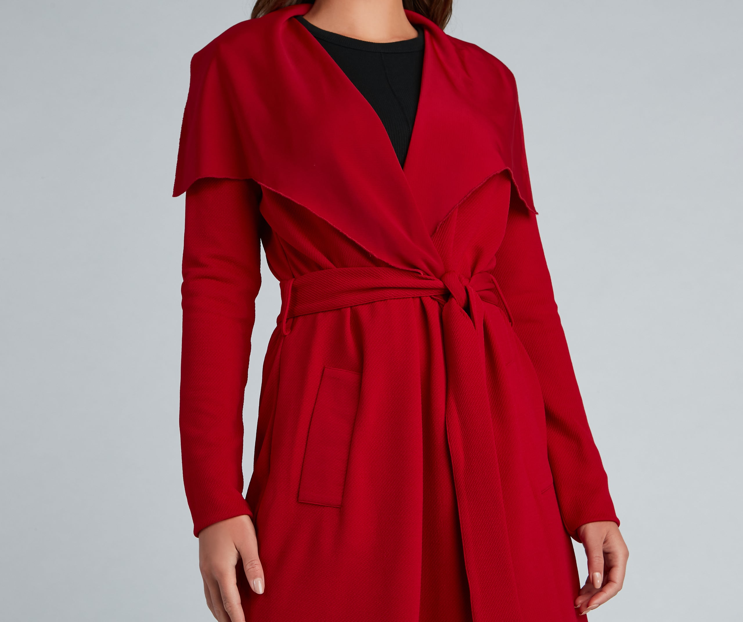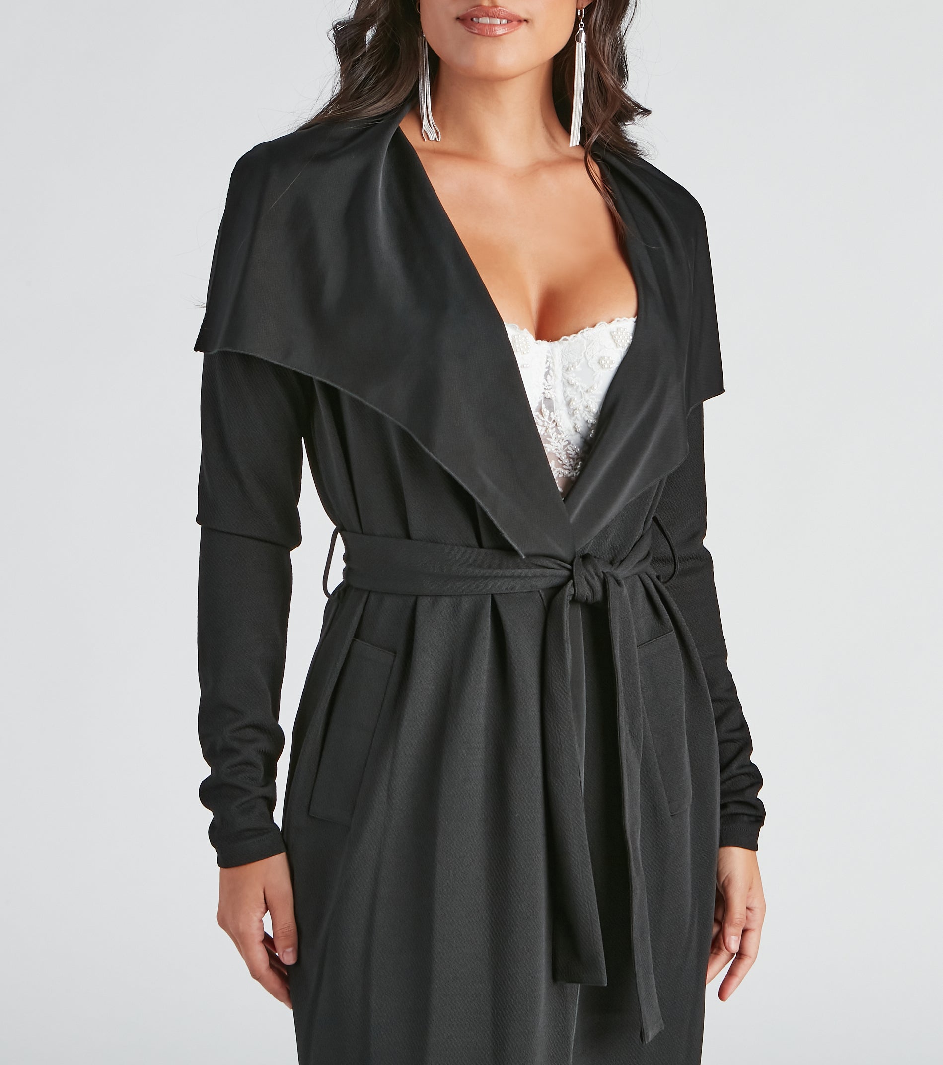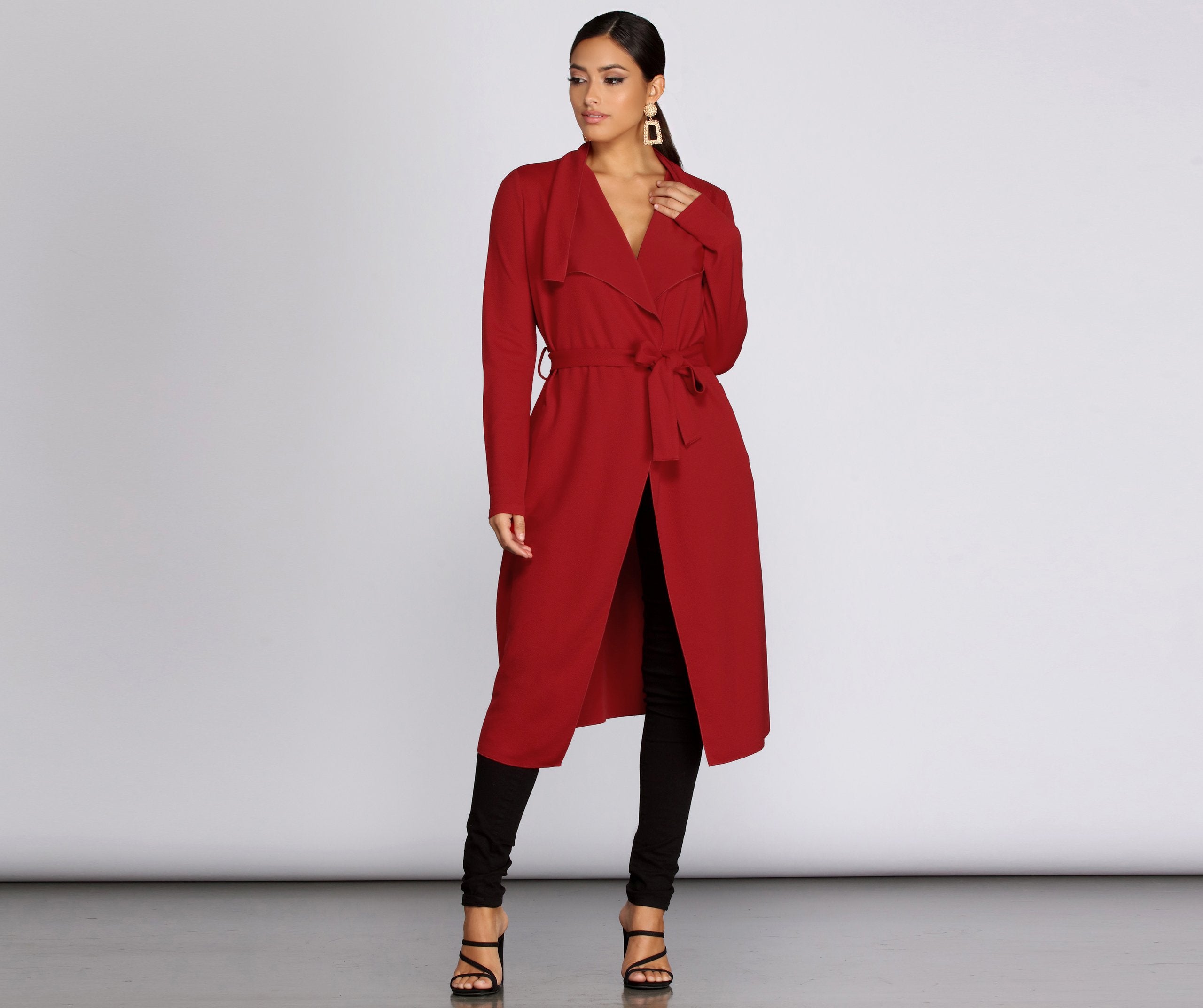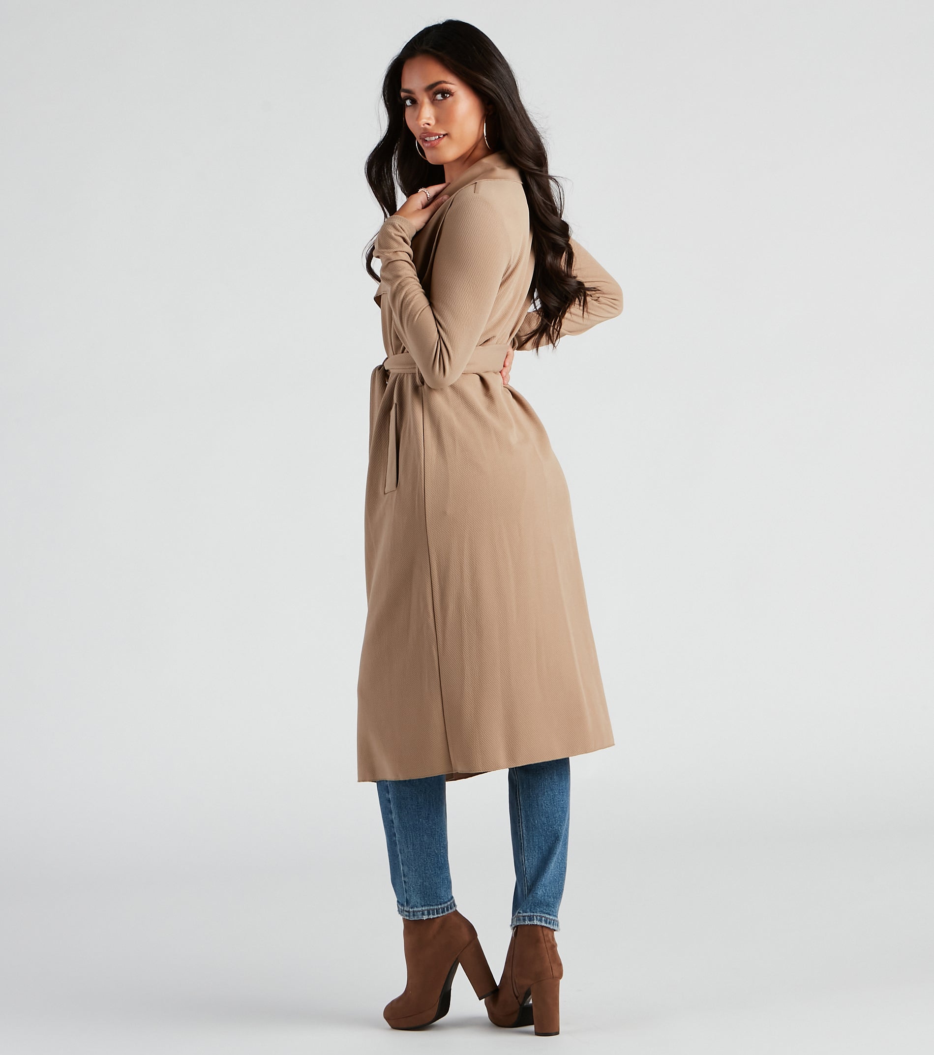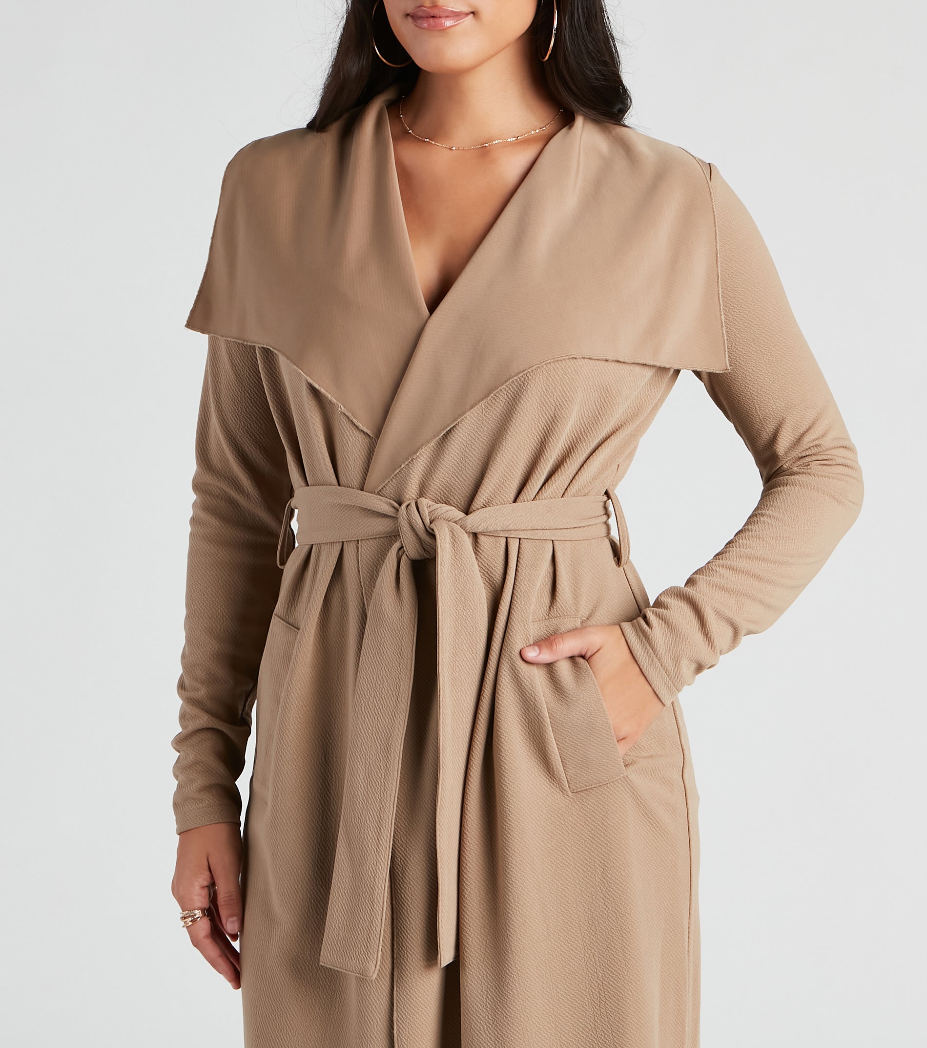 Go undercover in this chic trench but don’t cover up that cute outfit! This coat features a draped open front, lapel collar, fitted long sleeves, a removable tie waist belt that cinches your waist, and trendy side pockets. The textured lightweight woven fabric offers a relaxed fit and a moderate stretch. Complete your look in this trench coat with a basic bodysuit and high waist jeans.