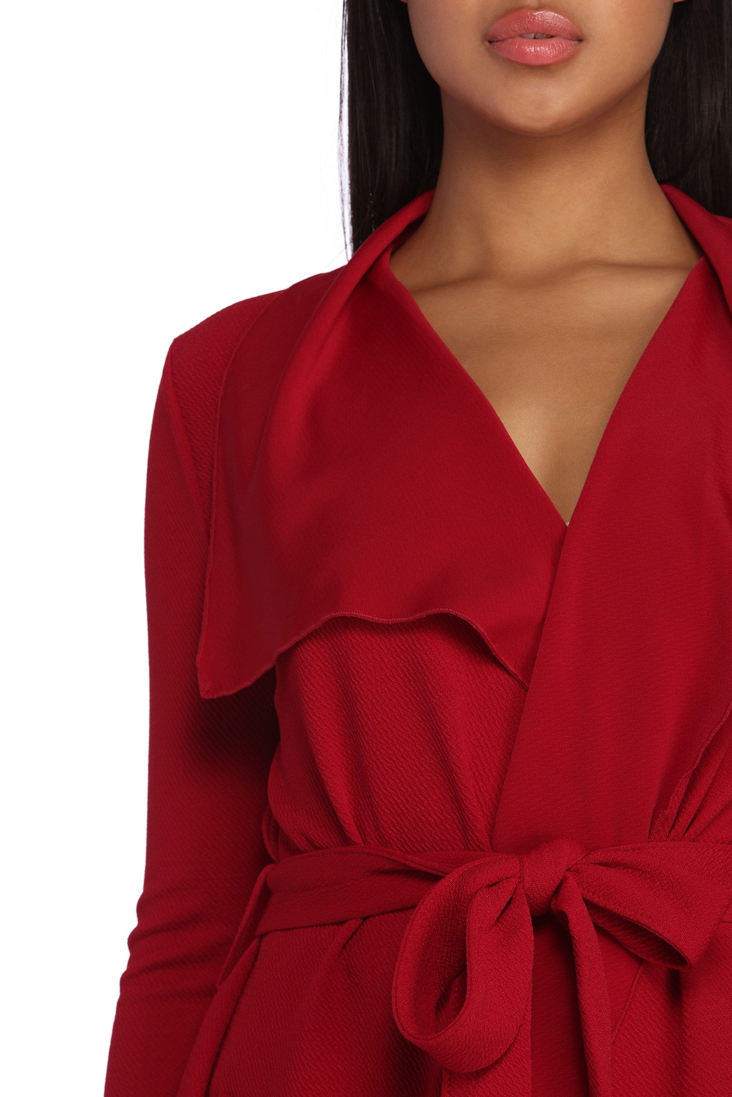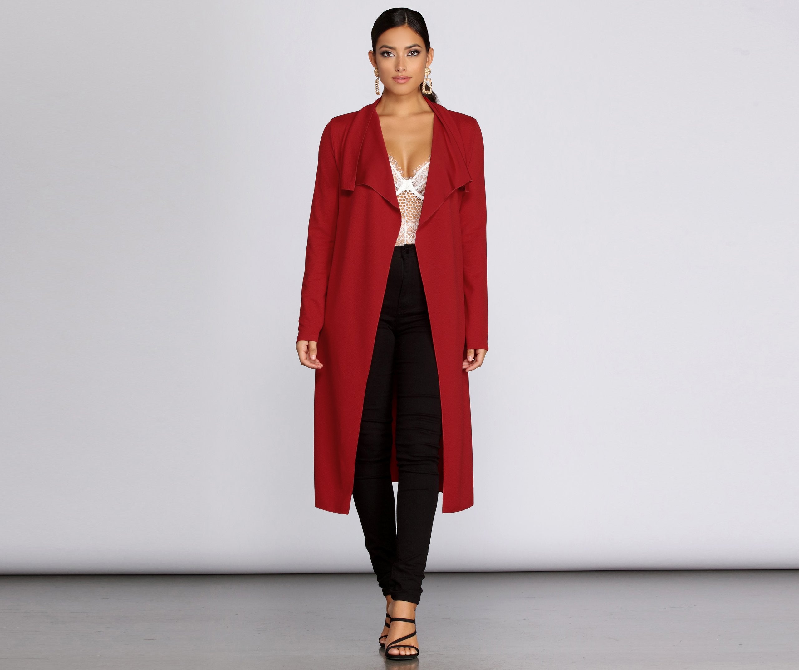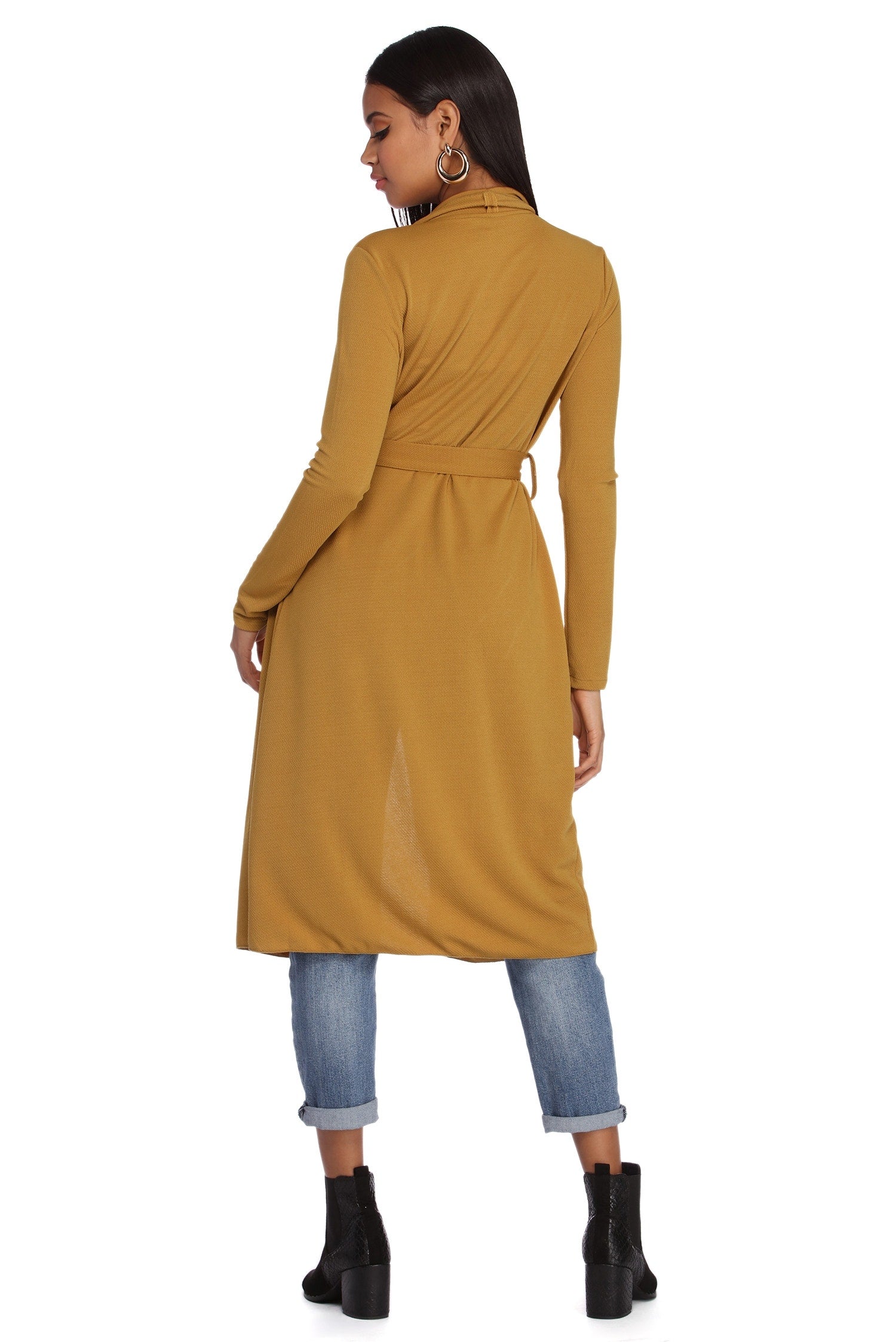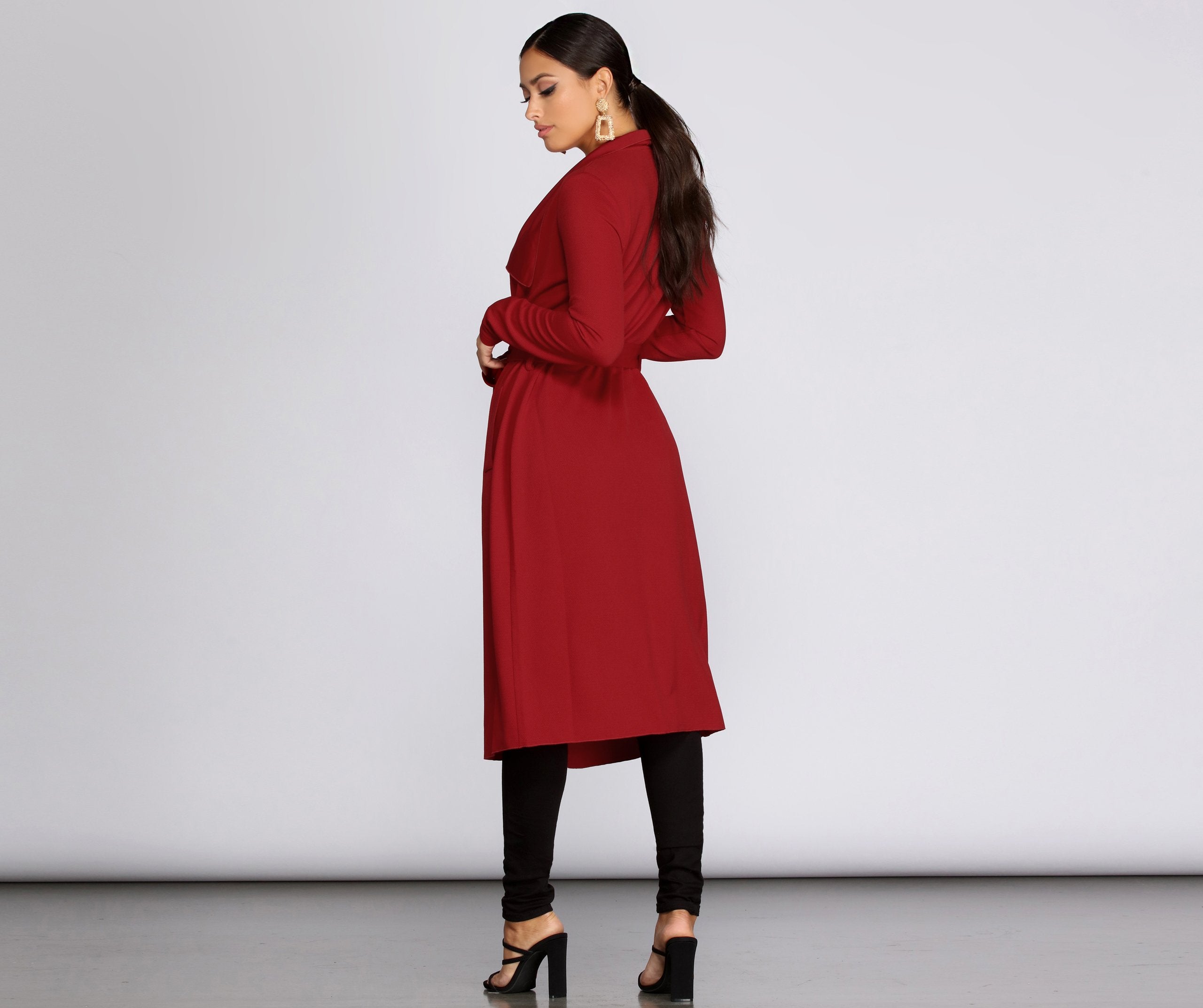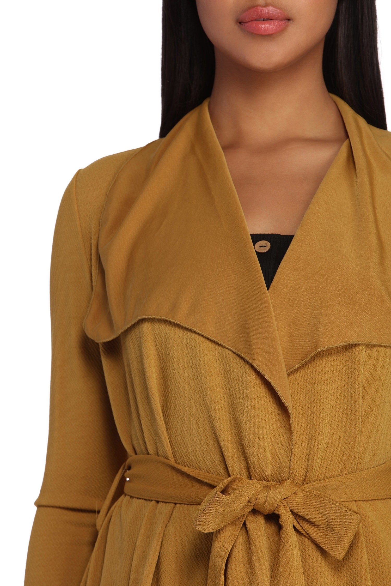 Go undercover in this chic trench but don’t cover up that cute outfit! This coat features a draped open front, lapel collar, fitted long sleeves, a removable tie waist belt that cinches your waist, and trendy side pockets. The textured lightweight woven fabric offers a relaxed fit and a moderate stretch. Complete your look in this trench coat with a basic bodysuit and high waist jeans.