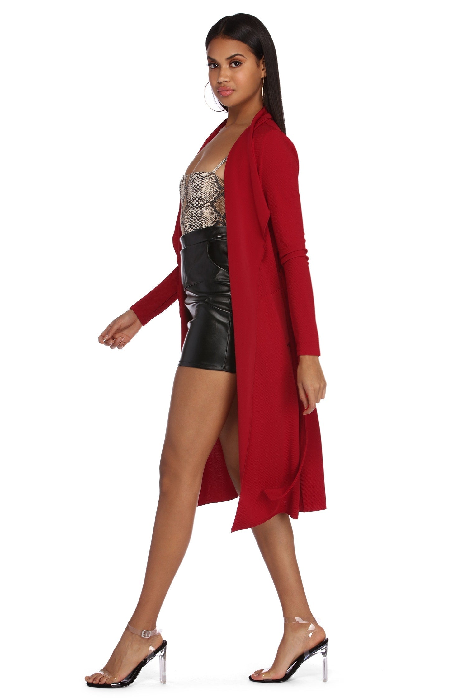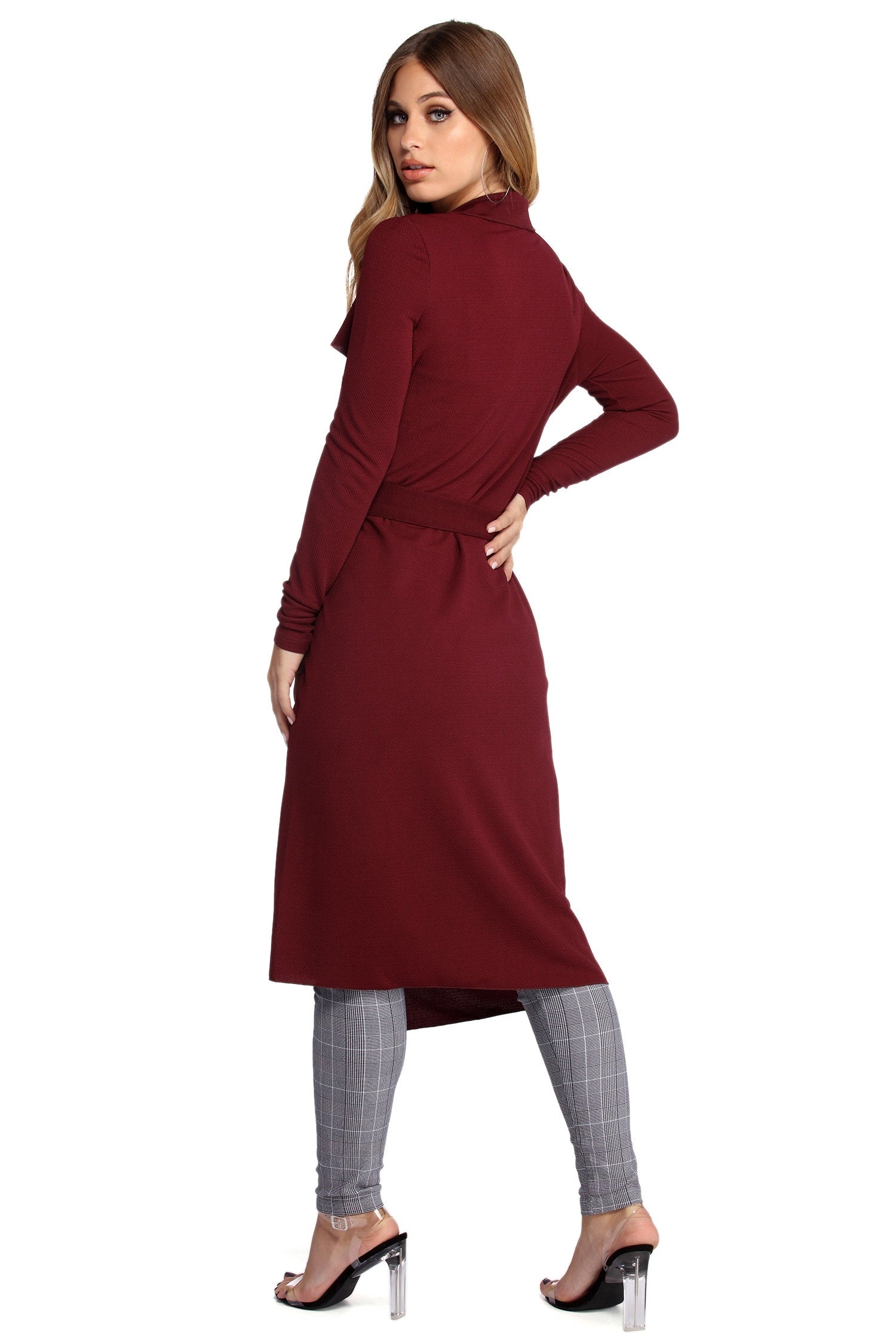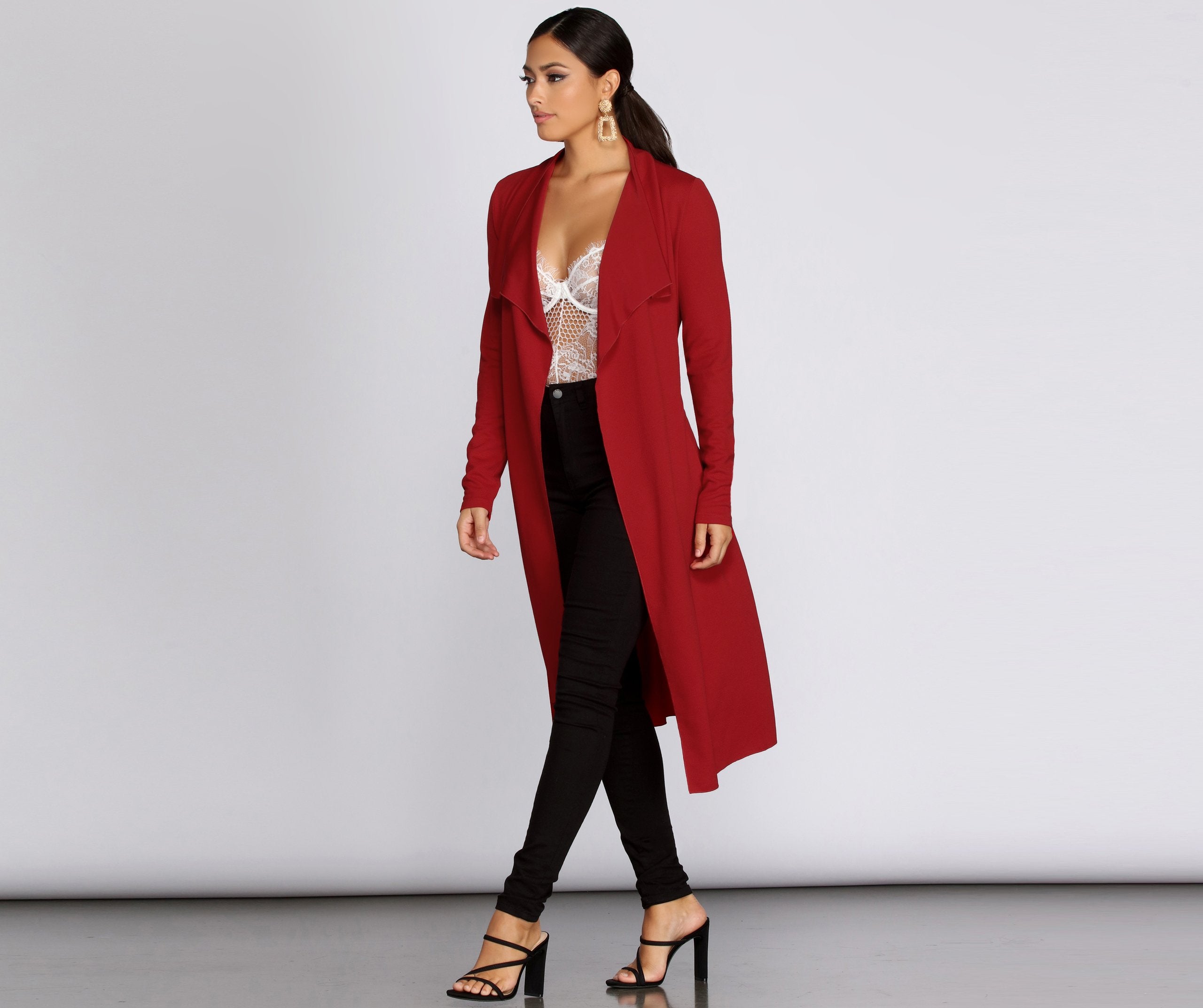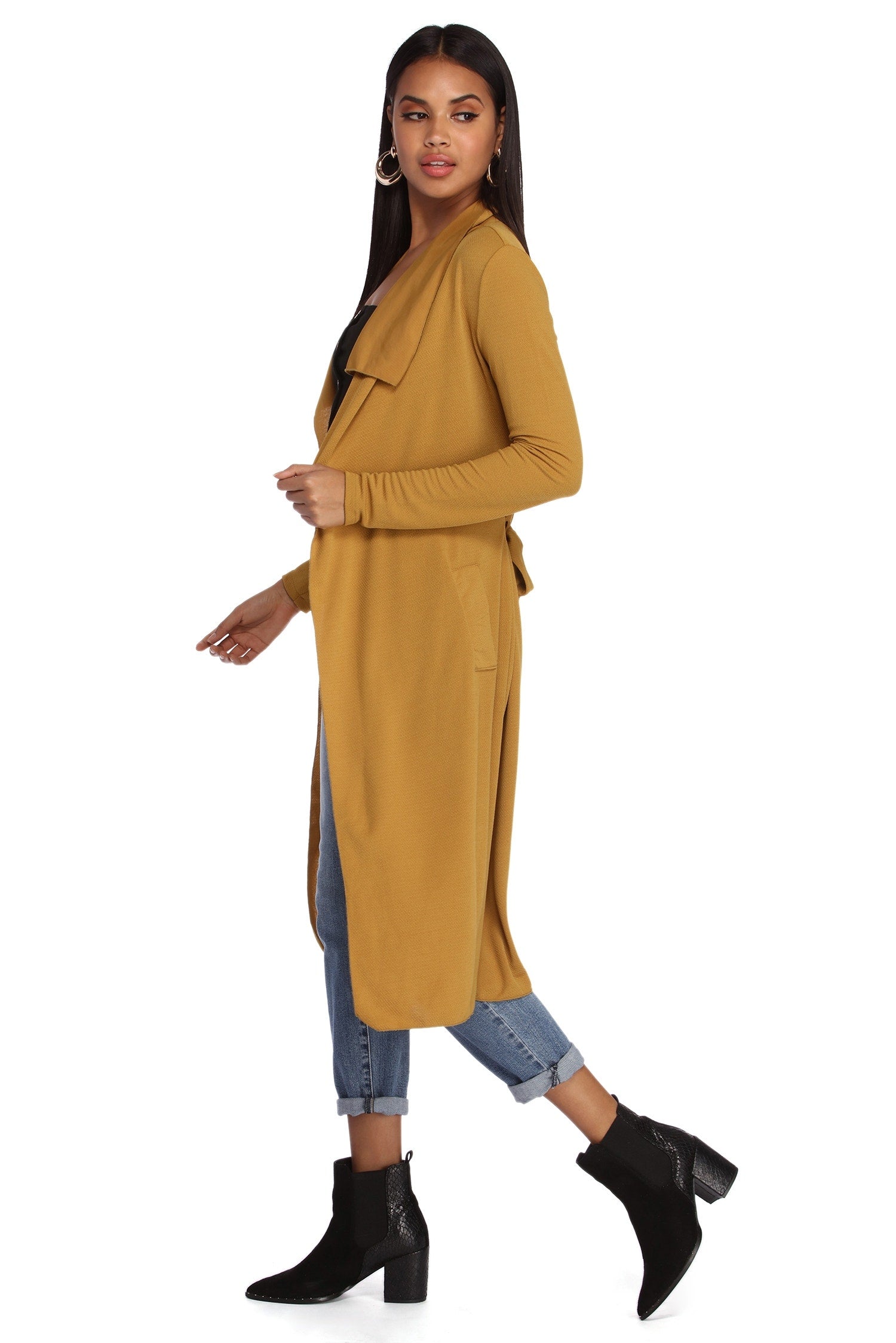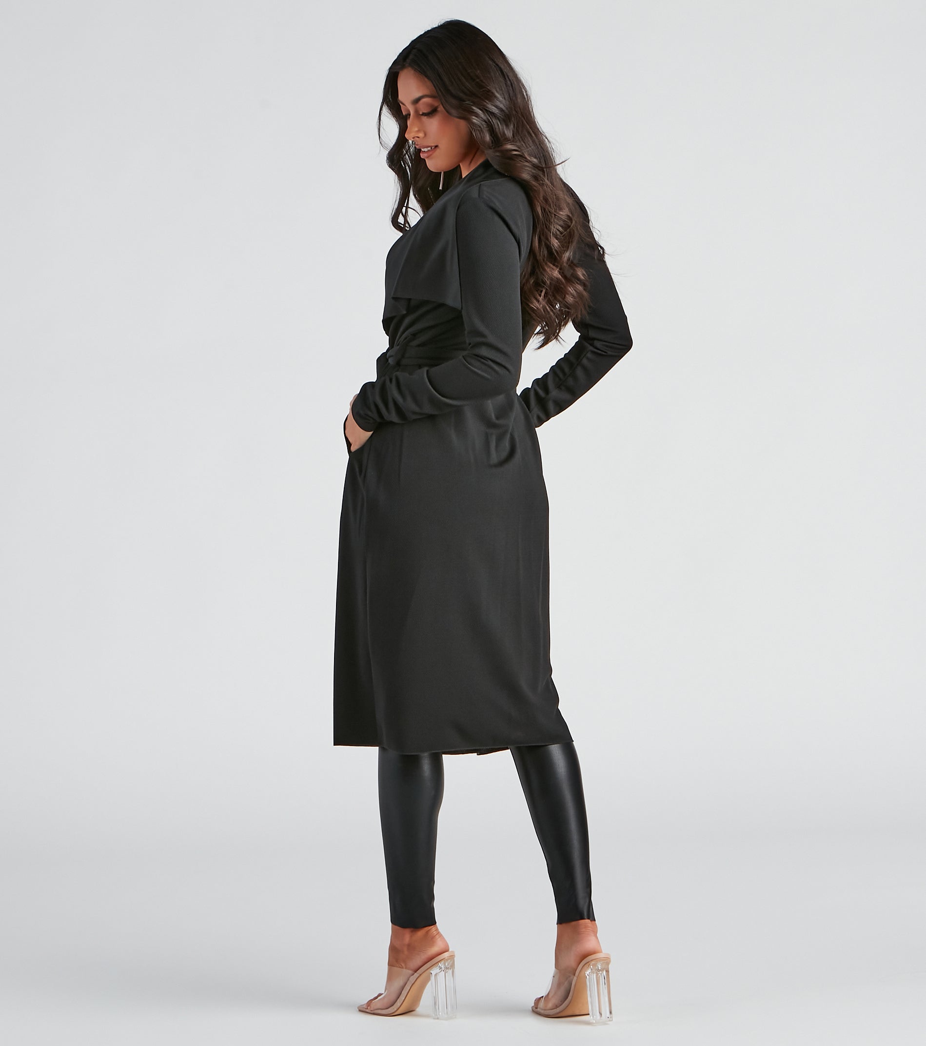 Go undercover in this chic trench but don’t cover up that cute outfit! This coat features a draped open front, lapel collar, fitted long sleeves, a removable tie waist belt that cinches your waist, and trendy side pockets. The textured lightweight woven fabric offers a relaxed fit and a moderate stretch. Complete your look in this trench coat with a basic bodysuit and high waist jeans.
