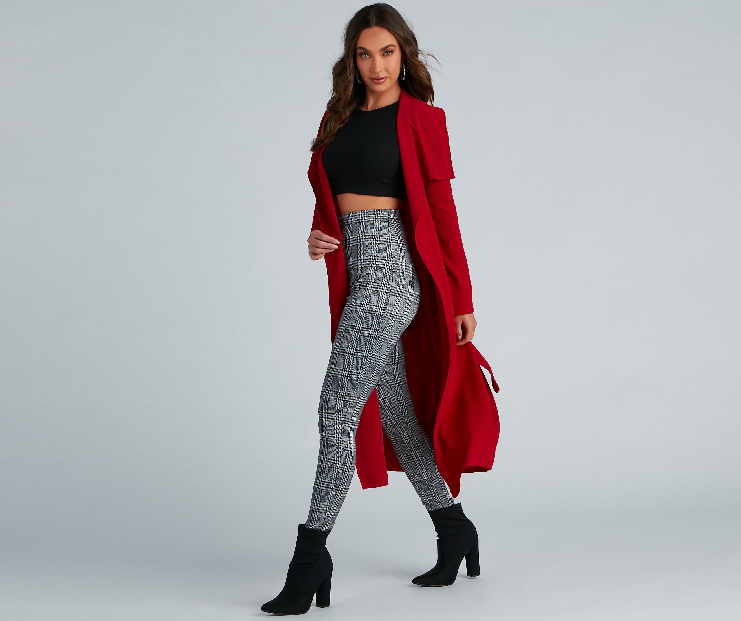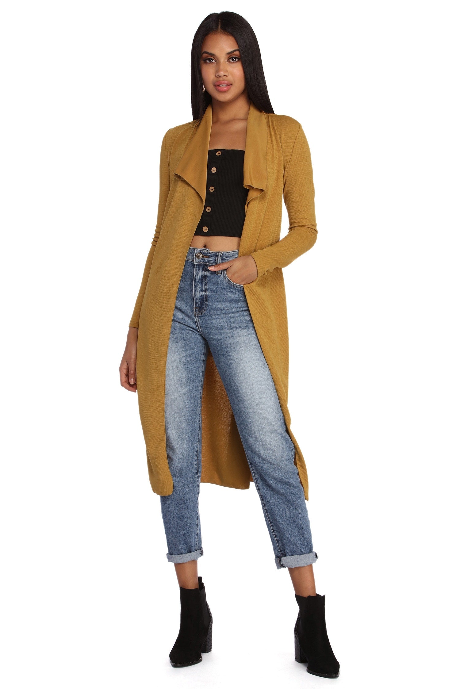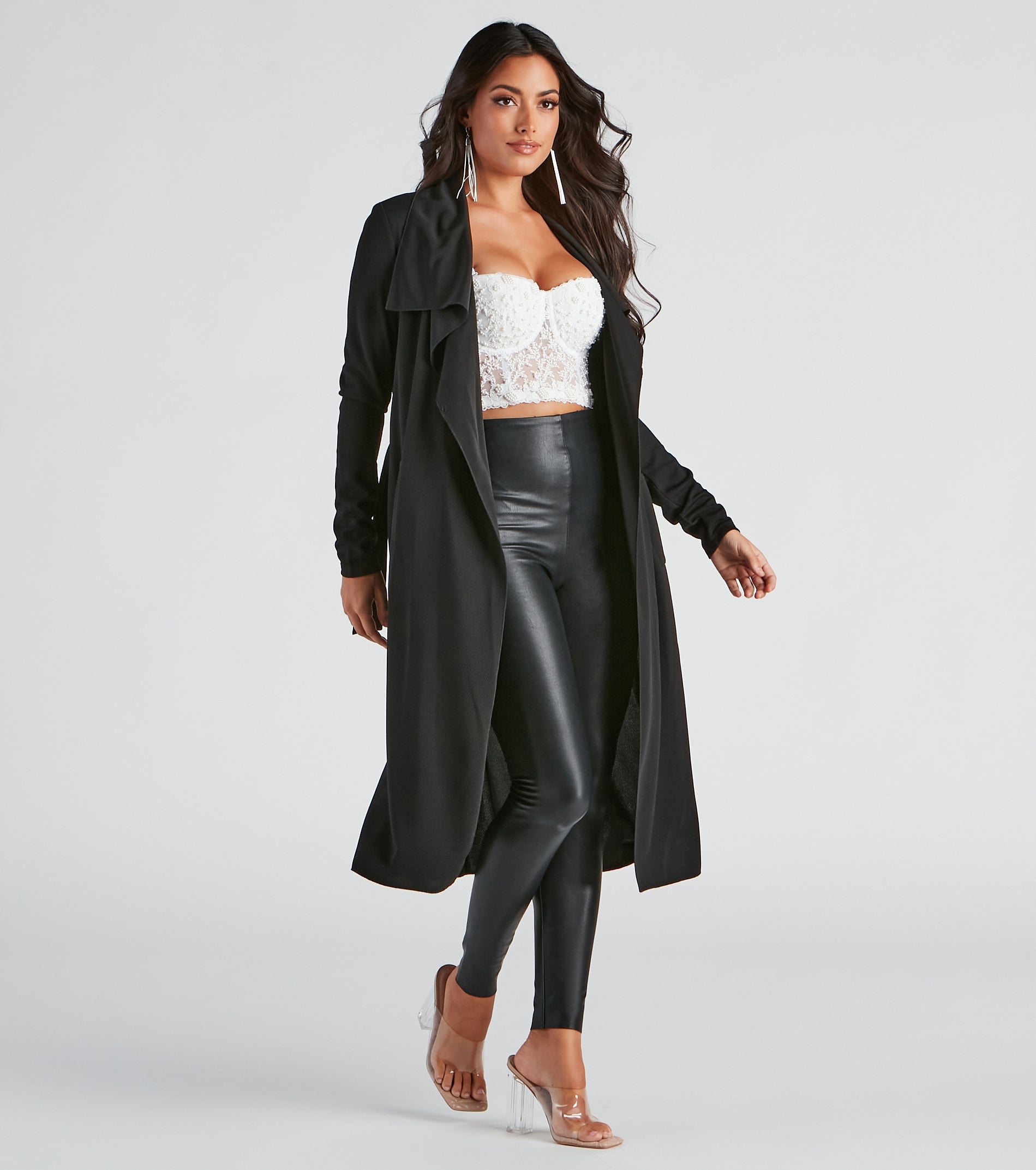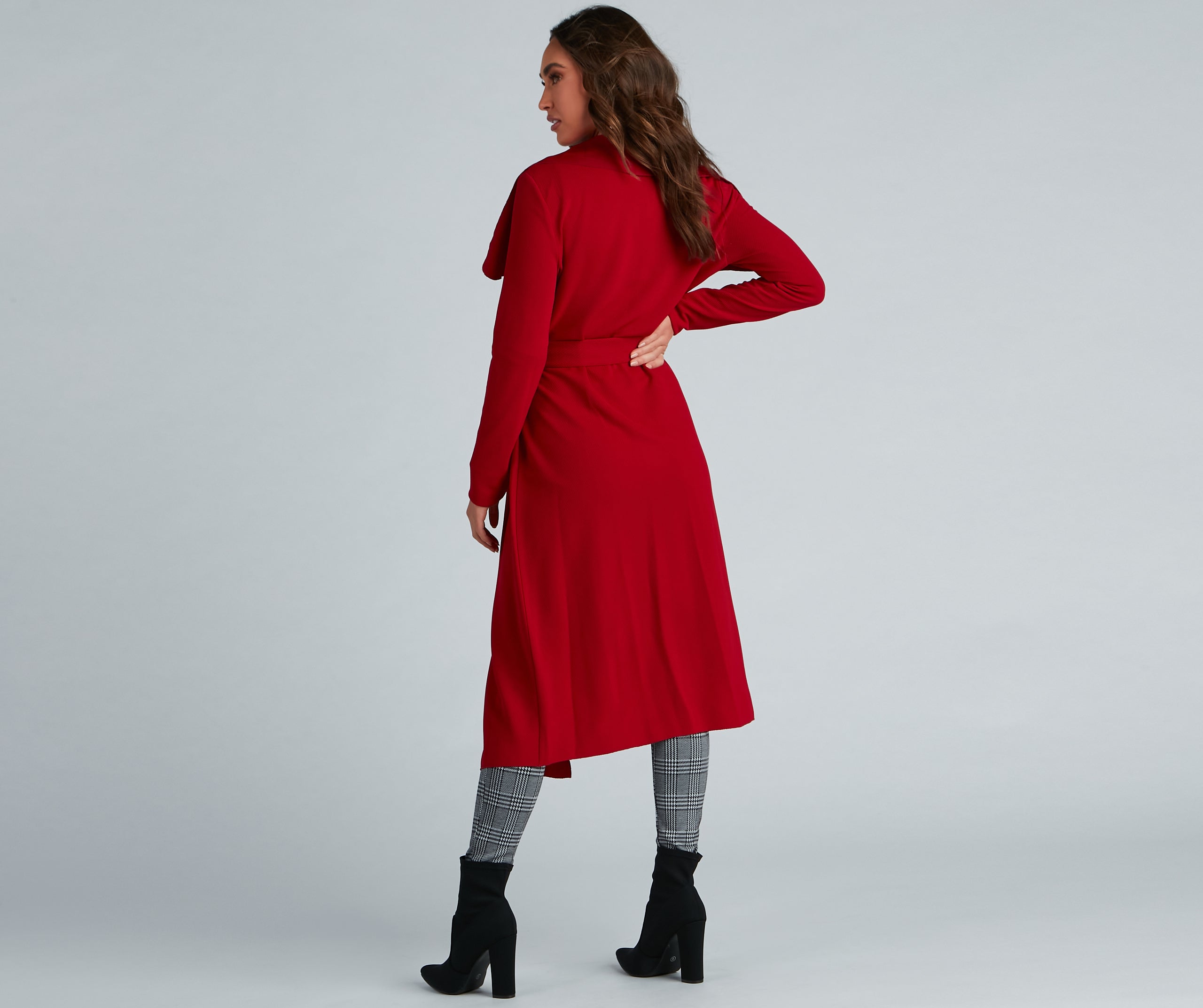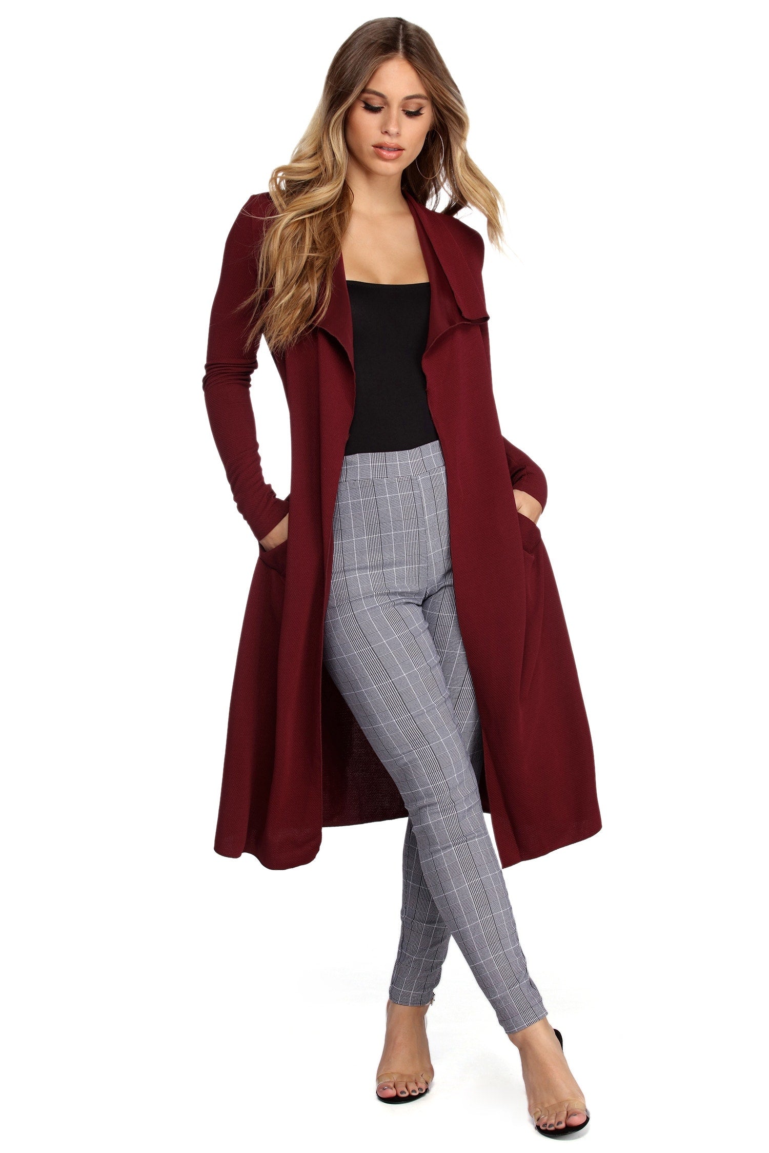 Go undercover in this chic trench but don’t cover up that cute outfit! This coat features a draped open front, lapel collar, fitted long sleeves, a removable tie waist belt that cinches your waist, and trendy side pockets. The textured lightweight woven fabric offers a relaxed fit and a moderate stretch. Complete your look in this trench coat with a basic bodysuit and high waist jeans.